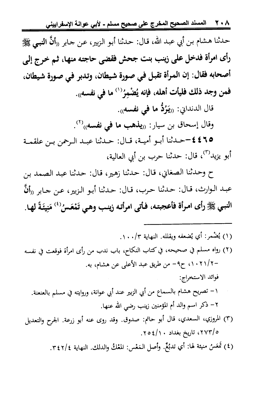 ح وحدثنا الصغاني، قال: حدثنا زهير، قال: حدثنا عبد الصمد بن عبد الوارث، قال: حدثنا حرب، قال: حدثنا أبو الزبير، عن جابر "أنَّ النبي -صلى الله عليه وسلم- رأى امرأة فأعجبته، فأتى امرأته زينب وهي تَمْعَسُ (¬2) مَنِيئَةً لها.