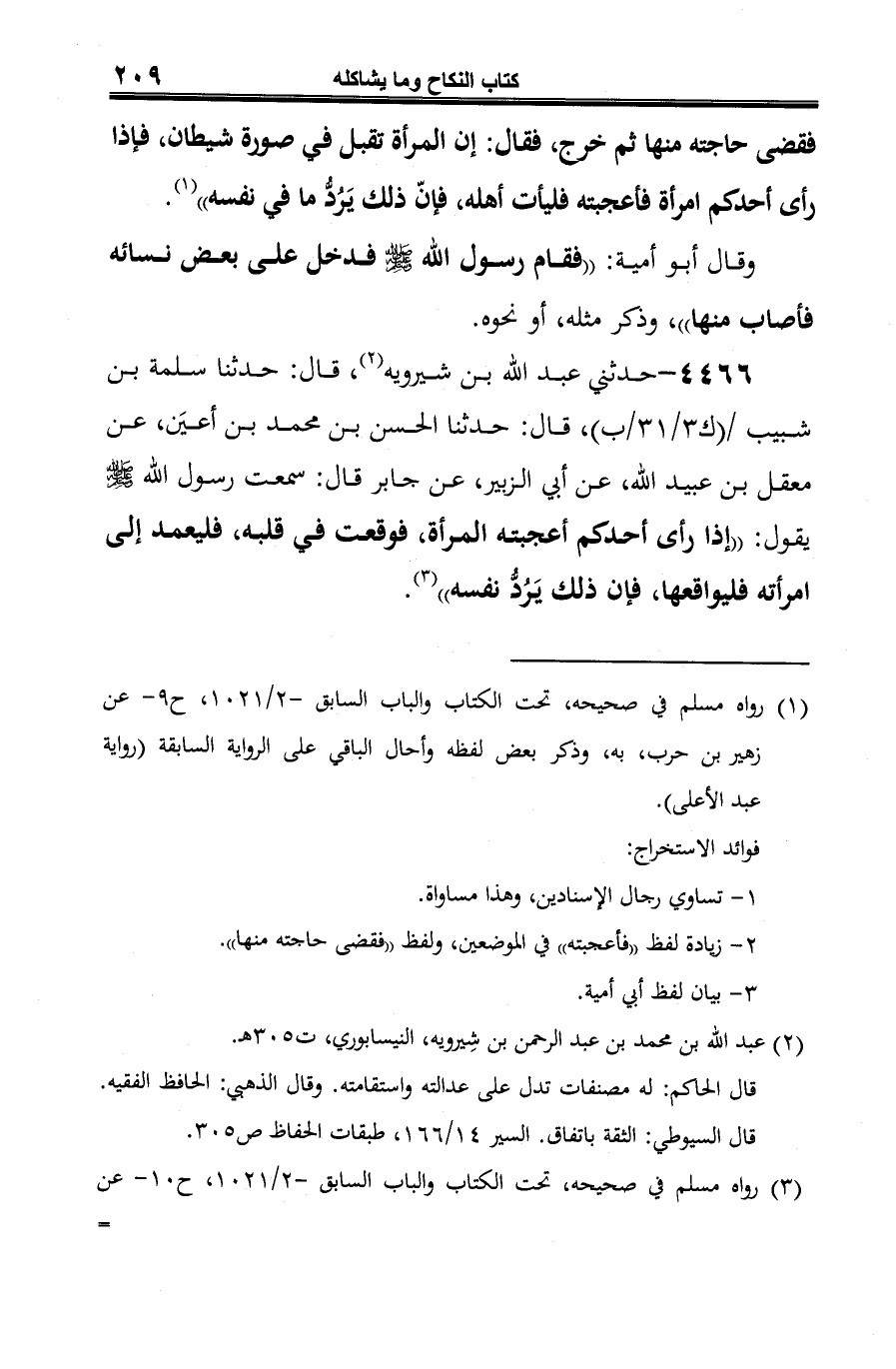 4466 - حدثني عبد الله بن شيرويه (¬1)، قال: حدثنا سلمة بن شبيب، قال: حدثنا الحسن بن محمَّد بن أعيَن، عن معقل بن عبيد الله، عن أبي الزبير، عن جابر قال: سمعت رسول الله -صلى الله عليه وسلم- يقول: "إذا رأى أحدكم أعجبته المرأة، فوقعت في قلبه، فليعمد إلى امرأته فليواقعها، فإن ذلك يَرُدُّ نفسه" (¬2).