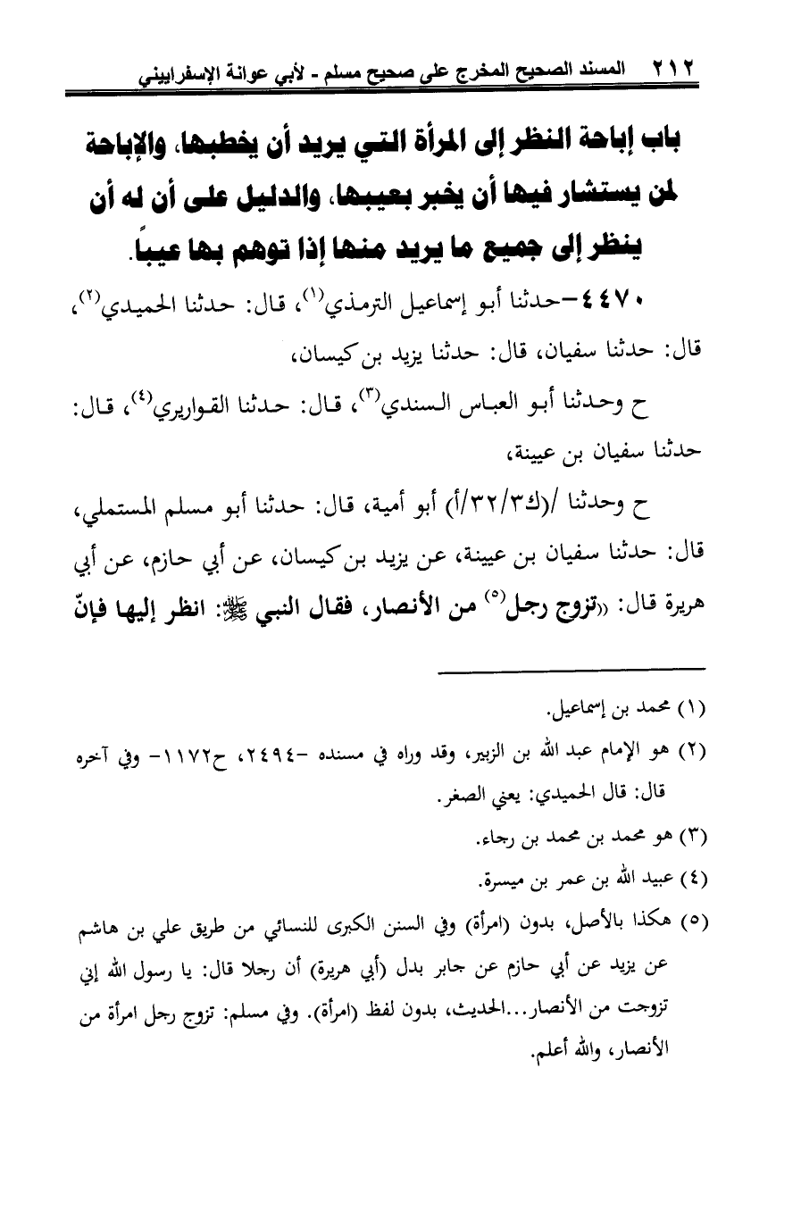ح وحدثنا أبو أمية، قال: حدثنا أبو مسلم المستملي، قال: حدثنا سفيان بن عيينة، عن يزيد بن كيسان، عن أبي حازم، عن أبي هريرة قال: "تزوج رجل (¬5) من الأنصار، فقال النّبي -صلى الله عليه وسلم-: انظر إليها فإنّ