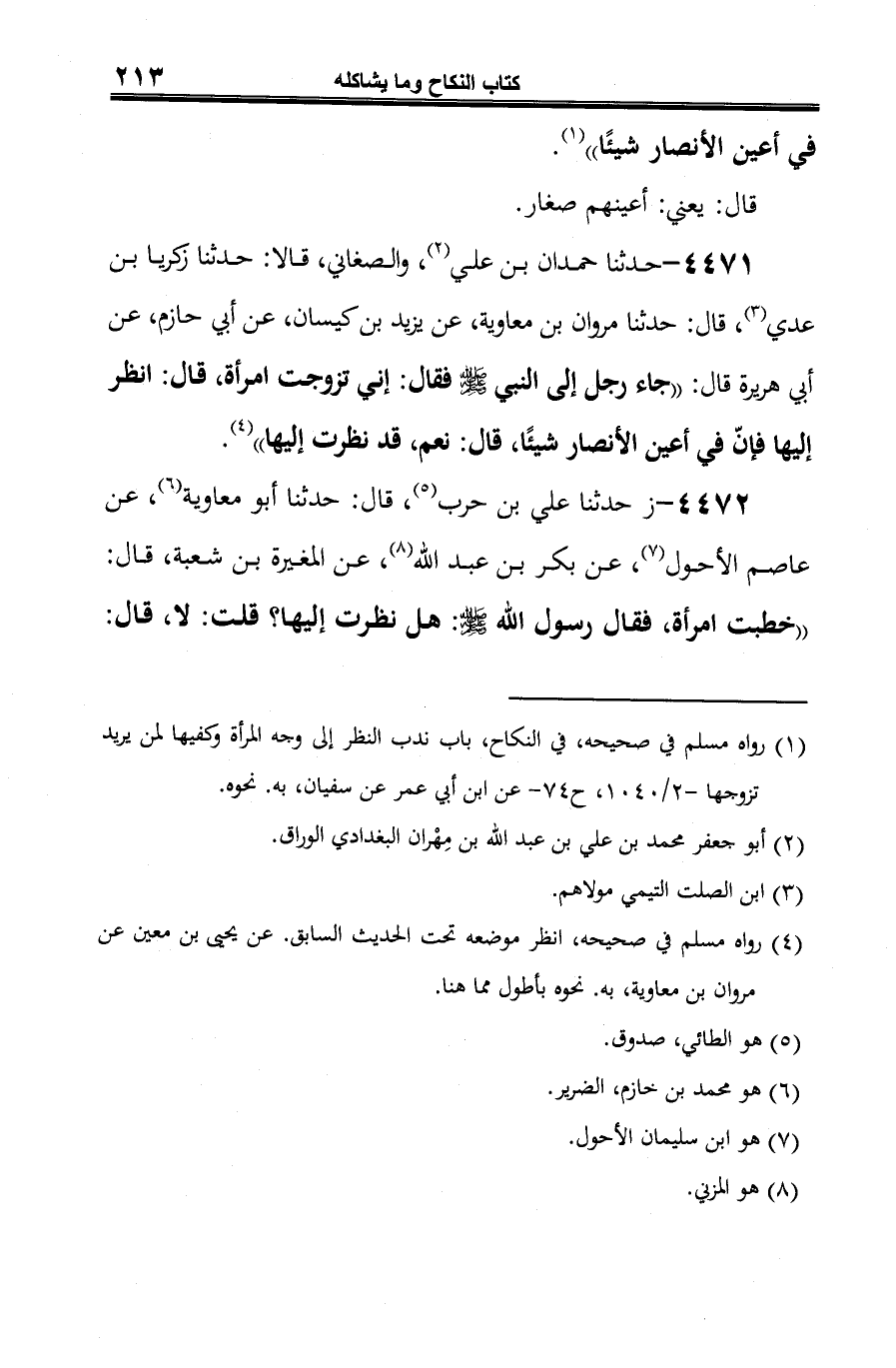 4471 - حدثنا حمدان بن علي (¬1)، والصغاني، قالا: حدثنا زكريا بن عدي (¬2)، قال: حدثنا مروان بن معاوية، عن يزيد بن كيسان، عن أبي حازم، عن أبي هريرة قال: "جاء رجل إلى النبي -صلى الله عليه وسلم- فقال: إني تزوجت امرأة، قال: انظر إليها فإنّ في أعين الأنصار شيئًا، قال: نعم، قد نظرت إليها" (¬3).