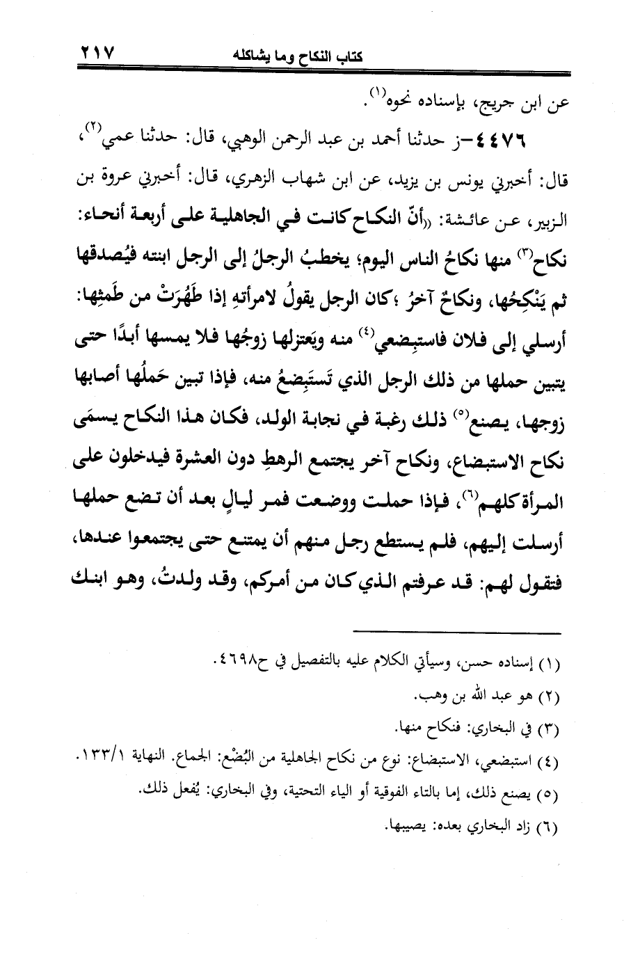 4476 - ز حدثنا أحمد بن عبد الرحمن الوهبي، قال: حدثنا عمي (¬1)، قال: أخبرني يونس بن يزيد، عن ابن شهاب الزهريّ، قال: أخبرني عروة بن الزبير، عن عائشة: "أنّ النكاح كانت في الجاهلية على أربعة أنحاء: نكاح (¬2) منها نكاحُ الناس اليوم؛ يخطبُ الرجلُ إلى الرجل ابنته فيُصدقها ثم يَنْكِحُها، ونكاحٌ آخرُ؛ كان الرجل يقولُ لامرأتهِ إذا طَهُرَتْ من طَمثِها: أرسلي إلى فلان فاستبِضعي (¬3) منه ويَعتزلها زوجُها فلا يمسها أبدًا حتى يتبين حملها من ذلك الرجل الذي تَستَبِضعُ منه، فإذا تبين حَملُها أصابها زوجها، يصنع (¬4) ذلك رغبة في نجابة الولد، فكان هذا النكاح يسمَى نكاح الاستبضاع، ونكاح آخر يجتمع الرهطِ دون العشرة فيدخلون على المرأة كلهم (¬5)، فإذا حملت ووضعت فمر ليالٍ بعد أن تضع حملها أرسلت إليهم، فلم يستطع رجل منهم أن يمتنع حتى يجتمعوا عندها، فتقول لهم: قد عرفتم الذي كان من أمركم، وقد ولدتُ، وهو ابنك