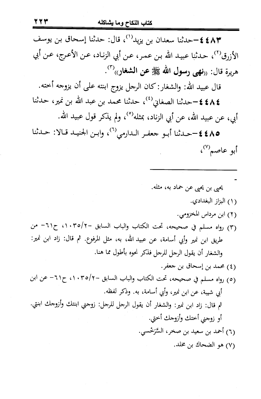 4483 - حدثنا سعدان بن يزيد (¬1)، قال: حدثنا إسحاق بن يوسف الأزرق (¬2)، حدثنا عبيد الله بن عمر، عن أبي الزناد، عن الأعرج، عن أبي هريرة قال: "نهى رسول الله -صلى الله عليه وسلم- عن الشغار" (¬3).
