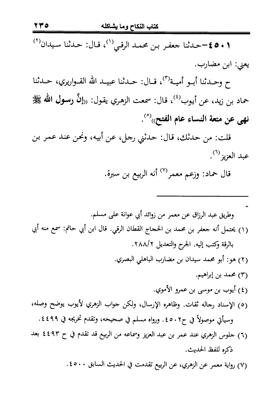 ح وحدثنا أبو أمية (¬3)، قال: حدثنا عبيد الله القواريري، حدثنا حماد بن زيد، عن أيوب (¬4)، قال: سمعت الزهريّ يقول: "إنَّ رسول الله -صلى الله عليه وسلم- نهى عن متعة النساء عام الفتح" (¬5).