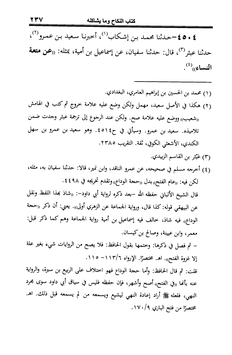 4504 - حدثنا محمَّد بن إشكاب (¬1)، أخبرنا سعيد بن عمرو (¬2)، حدثنا عبثر (¬3)، قال: حدثنا سفيان، عن إسماعيل بن أمية، بمثله: "عن متعة النساء" (¬4).
