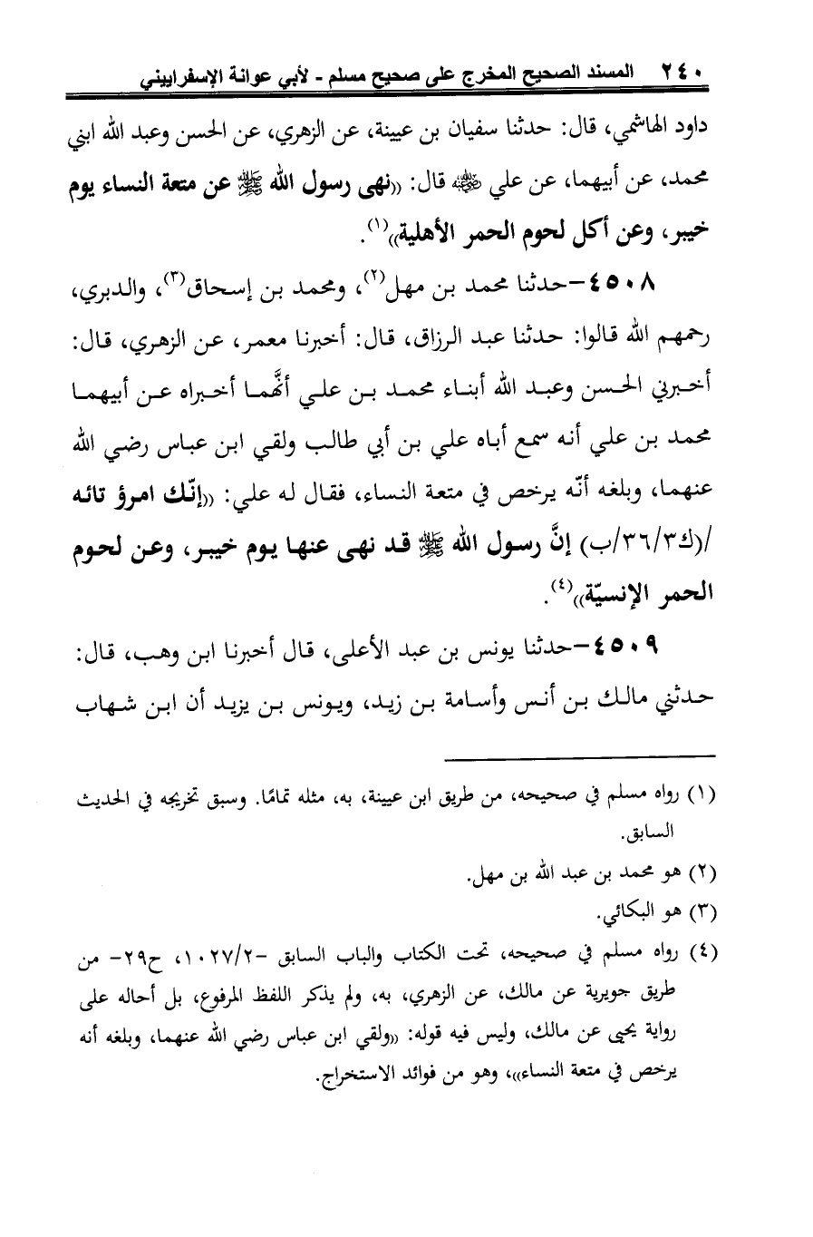 (¬3) رواه مسلم في صحيحه, تحت الكتاب والباب السابق-2/ 1027، ح 29 - من طريق جويرية عن مالك، عن الزهريّ، به، ولم يذكر اللفظ المرفوع، بل أحاله على رواية يحيى عن مالك، وليس فيه قوله: "ولقي ابن عباس رضي الله عنهما، وبلغه أنه يرخص في متعة النساء"، وهو من فوائد الاستخراج.