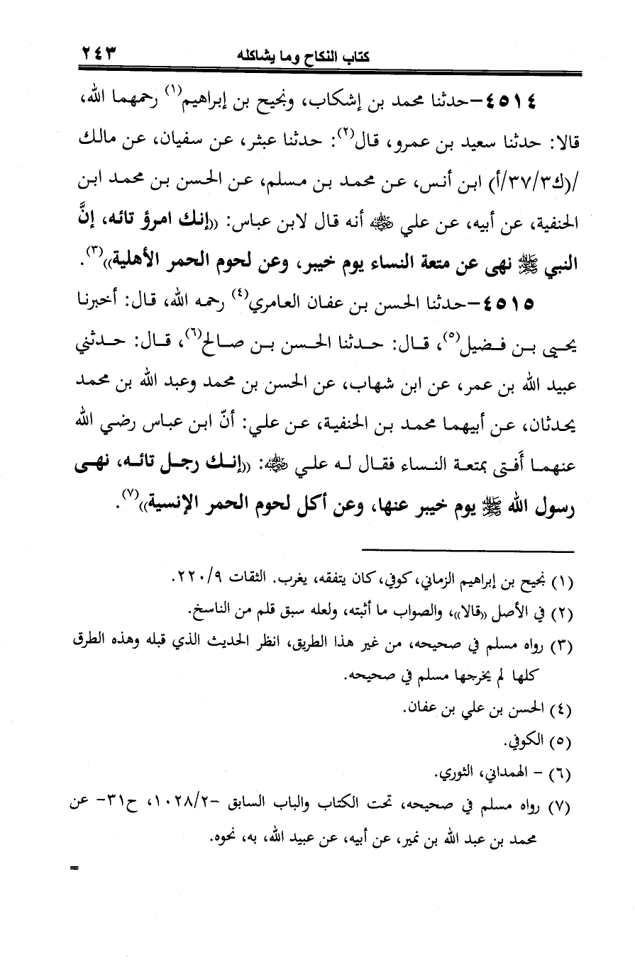 4515 - حدثنا الحسن بن عفان العامري (¬1) رحمه الله، قال: أخبرنا يحيى بن فضيل (¬2)، قال: حدثنا الحسن بن صالح (¬3)، قال: حدثني عبيد الله بن عمر، عن ابن شهاب، عن الحسن بن محمَّد وعبد الله بن محمَّد يحدثان، عن أبيهما محمَّد بن الحنفية، عن علي: أنّ ابن عباس رضي الله عنهما أَفتى بمتعة النساء فقال له علي -رضي الله عنه-: "إنك رجل تائه، نهى رسول الله -صلى الله عليه وسلم- يوم خيبر عنها، وعن أكل لحوم الحمر الإنسية" (¬4).