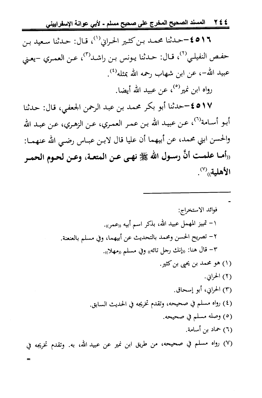 4517 - حدثنا أبو بكر محمَّد بن عبد الرحمن الجعفي، قال: حدثنا أبو أسامة (¬1)، عن عبيد الله بن عمر العمري، عن الزهريّ، عن عبد الله والحسن ابني محمَّد، عن أبيهما أن عليا قال لابن عباس رضي الله عنهما: "أما علمت أنَّ رسول الله -صلى الله عليه وسلم- نهى عن المتعة، وعن لحوم الحمر الأهلية" (¬2).