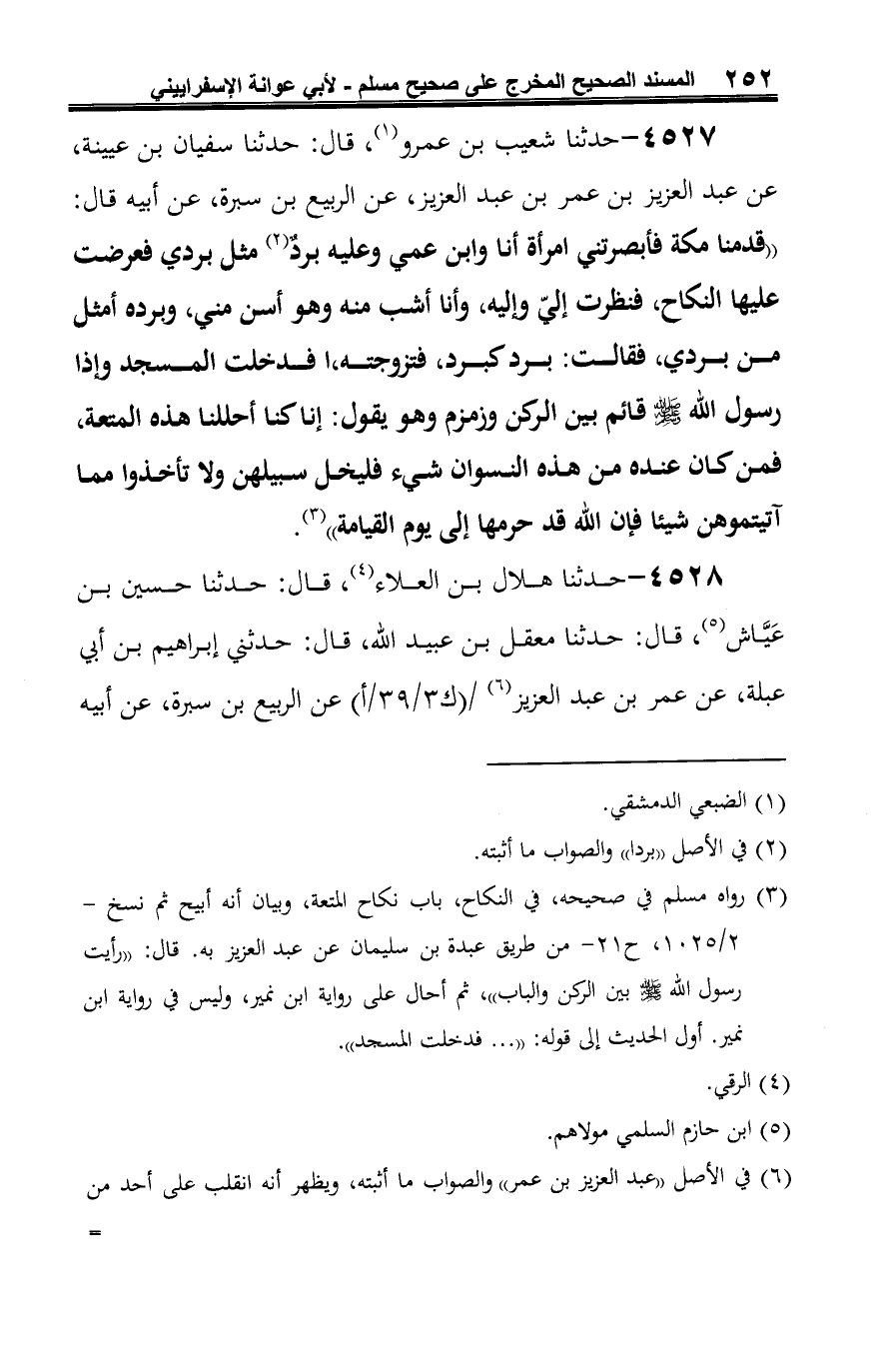 4527 - حدثنا شعيب بن عمرو (¬1)، قال: حدثنا سفيان بن عيينة، عن عبد العزيز بن عمر بن عبد العزيز، عن الربيع بن سبرة، عن أبيه قال: "قدمنا مكة فأبصرتني امرأة أنا وابن عمي وعليه بردٌ (¬2) مثل بردي فعرضت عليها النكاح، فنظرت إليّ وإليه، وأنا أشب منه وهو أسن مني، وبرده أمثل من بردي، فقالت: برد كبرد، فتزوجتها، فدخلت المسجد وإذا رسول الله -صلى الله عليه وسلم- قائم بين الركن وزمزم وهو يقول: إنا كنا أحللنا هذه المتعة، فمن كان عنده من هذه النسوان شيء فليخل سبيلهن ولا تأخذوا مما آتيتموهن شيئًا فإن الله قد حرمها إلى يوم القيامة" (¬3).