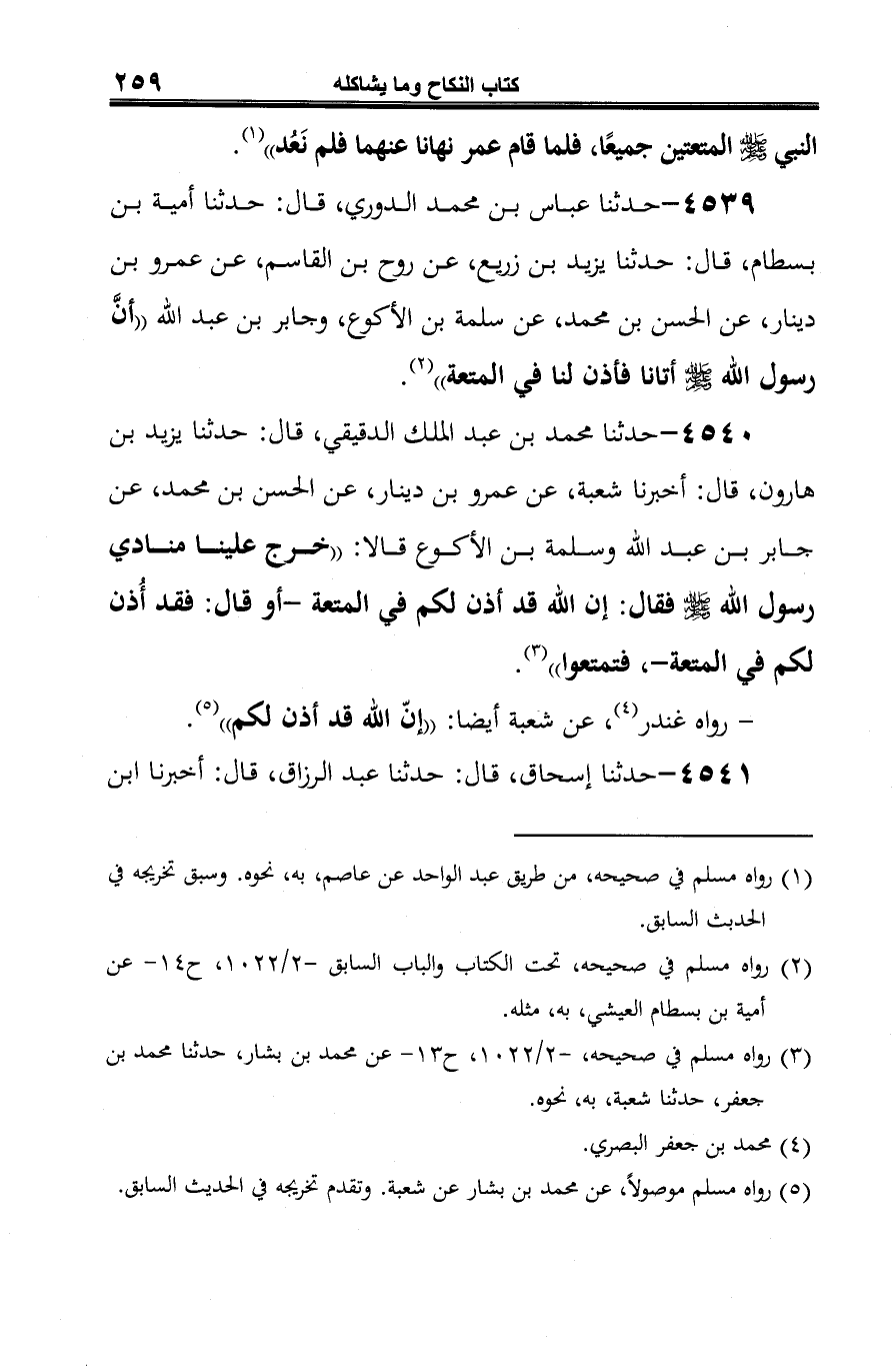 4539 - حدثنا عباس بن محمَّد الدوري، قال: حدثنا أمية بن بسطام، قال: حدثنا يزيد بن زريع، عن روح بن القاسم، عن عمرو بن دينار، عن الحسن بن محمَّد، عن سلمة بن الأكوع، وجابر بن عبد الله "أنَّ رسول الله -صلى الله عليه وسلم - أتانا فأذن لنا في المتعة" (¬1).