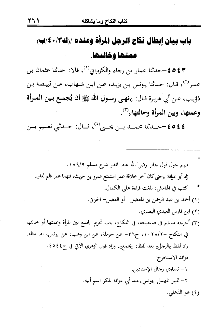 4543 - حدثنا عمار بن رجاء والكزبراني (¬1)، قالا: حدثنا عثمان بن عمر (¬2)، قال: حدثنا يونس بن يزيد، عن ابن شهاب، عن قبيصة بن ذؤيب، عن أبي هريرة قال: "نهى رسول الله -صلى الله عليه وسلم- أن يُجمع بين المرأة وعمتها، وبين المرأة وخالتها" (¬3).