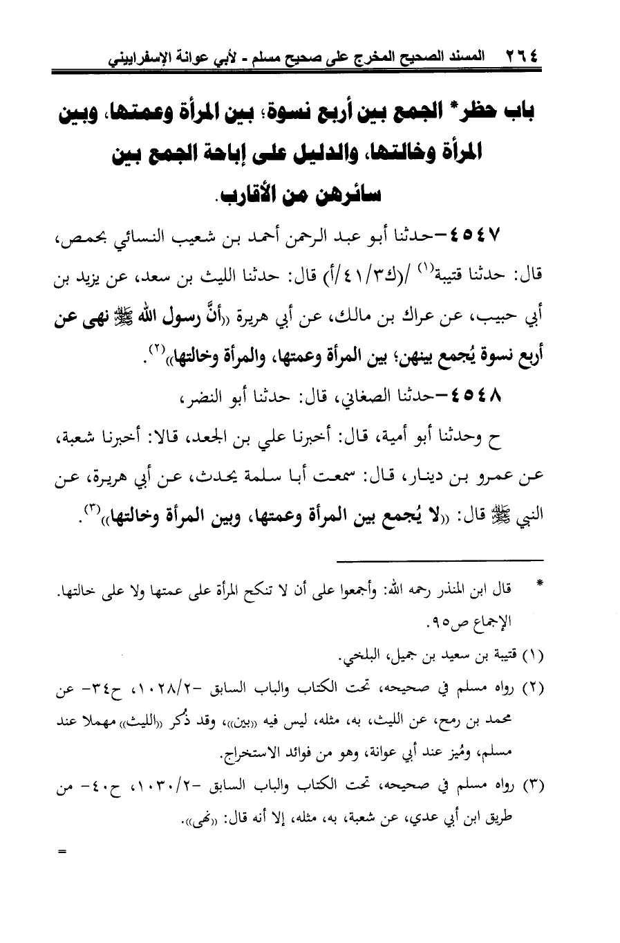 4547 - حدثنا أبو عبد الرحمن أحمد بن شعيب النسائي بحمص، قال: حدثنا قتيبة (¬1) قال: حدثنا الليث بن سعد، عن يزيد بن أبي حبيب، عن عراك بن مالك، عن أبي هريرة "أنَّ رسول الله -صلى الله عليه وسلم- نهى عن أربع نسوة يُجمع بينهن؛ بين المرأة وعمتها، والمرأة وخالتها" (¬2).