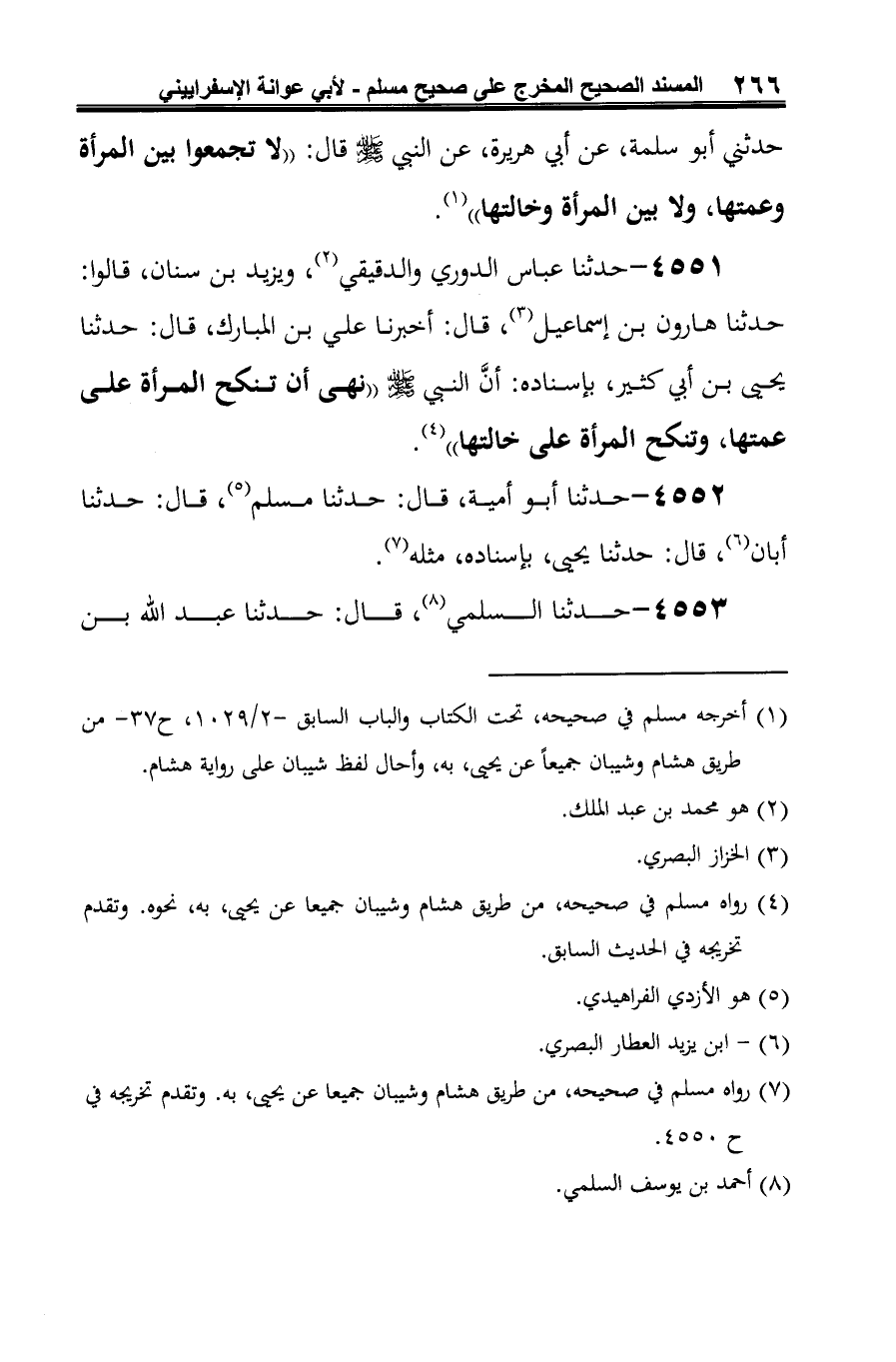4551 - حدثنا عباس الدوري والدقيقي (¬1)، ويزيد بن سنان، قالوا: حدثنا هارون بن إسماعيل (¬2)، قال: أخبرنا علي بن المبارك، قال: حدثنا يحيى بن أبي كثير، بإسناده: أنَّ النبي -صلى الله عليه وسلم- "نهى أن تنكح المرأة على عمتها، وتنكح المرأة على خالتها" (¬3).