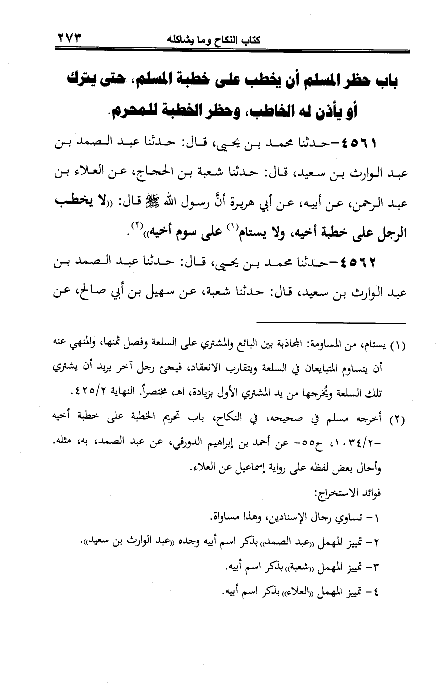 4561 - حدثنا محمد بن يحيى، قال: حدثنا عبد الصمد بن عبد الوارث بن سعيد، قال: حدثنا شعبة بن الحجاج، عن العلاء بن عبد الرحمن، عن أبيه، عن أبي هريرة أنَّ رسول الله -صلى الله عليه وسلم- قال: "لا يخطب الرجل على خطبة أخيه، ولا يستام (¬1) على سوم أخيه" (¬2).