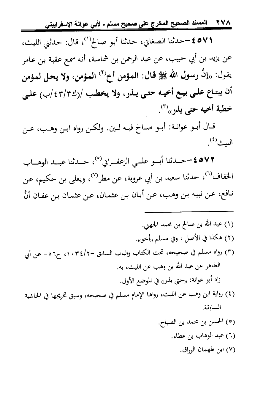 4571 - حدثنا الصغاني، حدثنا أبو صالح (¬1)، قال: حدثني الليث، عن يزيد بن أبي حبيب، عن عبد الرحمن بن شماسة، أنه سمع عقبة بن عامر يقول: "إنَّ رسول الله -صلى الله عليه وسلم- قال: المؤمن أخ (¬2) المؤمن، ولا يحل لمؤمن أن يبتاع على بيع أخيه حتى يذر، ولا يخطب على خطبة أخيه حتى يذر" (¬3).