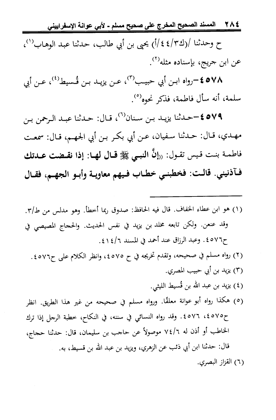 (¬3) هكذا رواه أبو عوانة معلقًا. ورواه مسلم في صحيحه من غير هذا الطريق. انظر ح 4575، 4576. وقد رواه النسائي في سننه، في النكاح، خطبة الرجل إذا ترك الخاطب أو أذن له 6/ 74 موصولًا عن حاجب بن سليمان، قال: حدثنا حجاج، قال: حدثنا ابن أبي ذئب عن الزهري، ويزيد بن عبد الله بن قسيط، به.