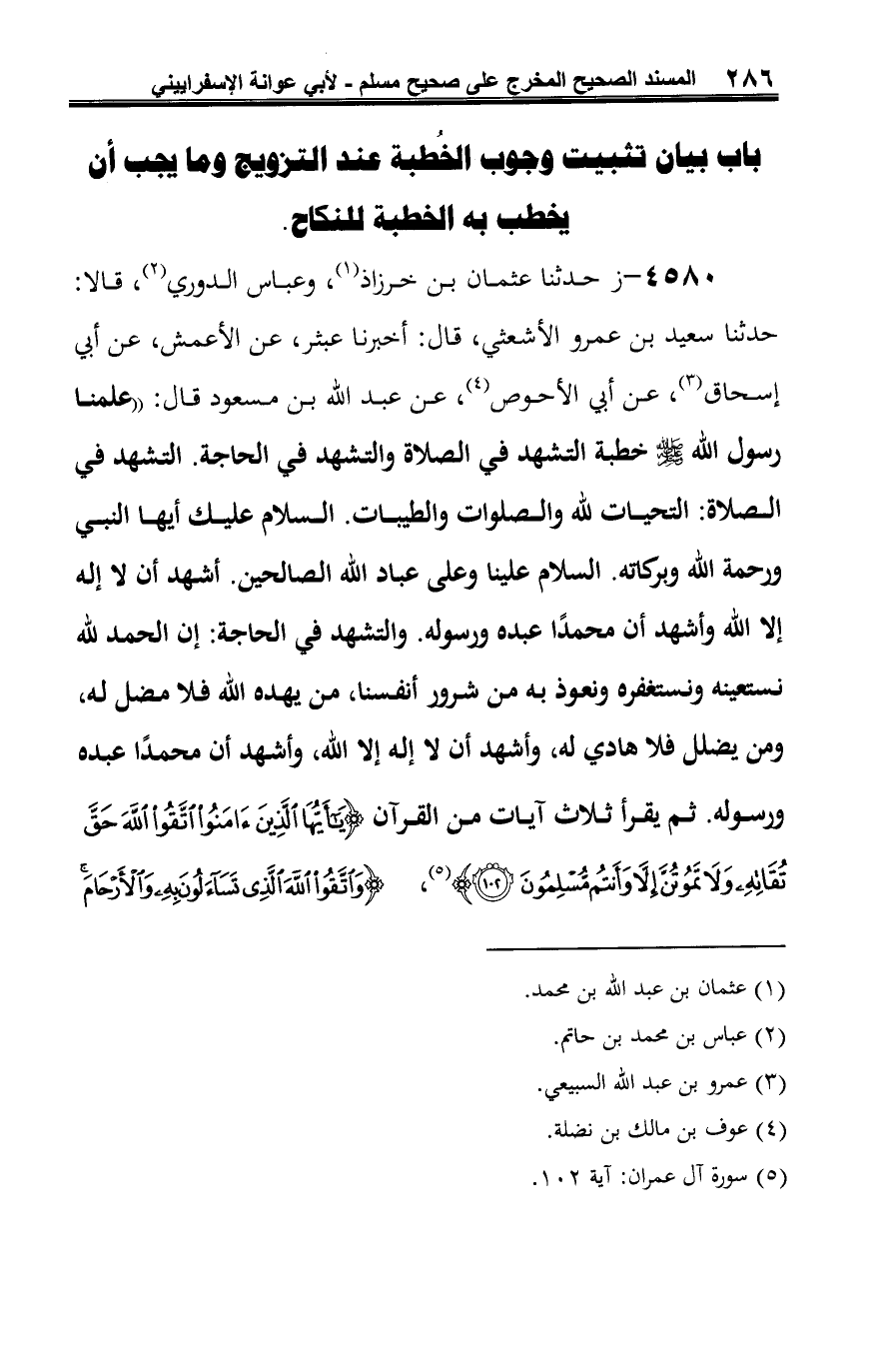 4580 - ز حدثنا عثمان بن خرزاذ (¬1)، وعباس الدوري (¬2)، قالا: حدثنا سعيد بن عمرو الأشعثي، قال: أخبرنا عبثر، عن الأعمش، عن أبي إسحاق (¬3)، عن أبي الأحوص (¬4)، عن عبد الله بن مسعود قال: "علمنا رسول الله -صلى الله عليه وسلم- خطبة التشهد في الصلاة والتشهد في الحاجة. التشهد في الصلاة: التحيات لله والصلوات والطيبات. السلام عليك أيها النبي ورحمة الله وبركاته. السلام علينا وعلى عباد الله الصالحين. أشهد أن لا إله إلا الله وأشهد أن محمدًا عبده ورسوله. والتشهد في الحاجة: إن الحمد لله نستعينه ونستغفره ونعوذ به من شرور أنفسنا، من يهده الله فلا مضل له، ومن يضلل فلا هادي له، وأشهد أن لا إله إلا الله، وأشهد أن محمدًا عبده ورسوله. ثم يقرأ ثلاث آيات من القرآن {يَاأَيُّهَا الَّذِينَ آمَنُوا اتَّقُوا اللَّهَ حَقَّ تُقَاتِهِ وَلَا تَمُوتُنَّ إِلَّا وَأَنْتُمْ مُسْلِمُونَ (102)} (¬5)، {وَاتَّقُوا اللَّهَ الَّذِي تَسَاءَلُونَ بِهِ وَالْأَرْحَامَ
