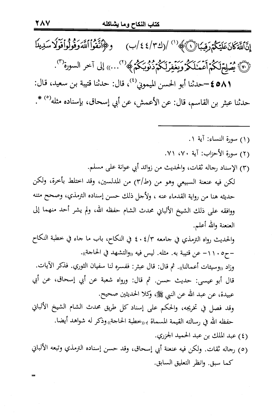 (¬2) رجاله ثقات. ولكن فيه عنعنة أبي إسحاق، وقد حسن إسناده الترمذي وتبعه الألباني كما سبق. وانظر التعليق السابق.
