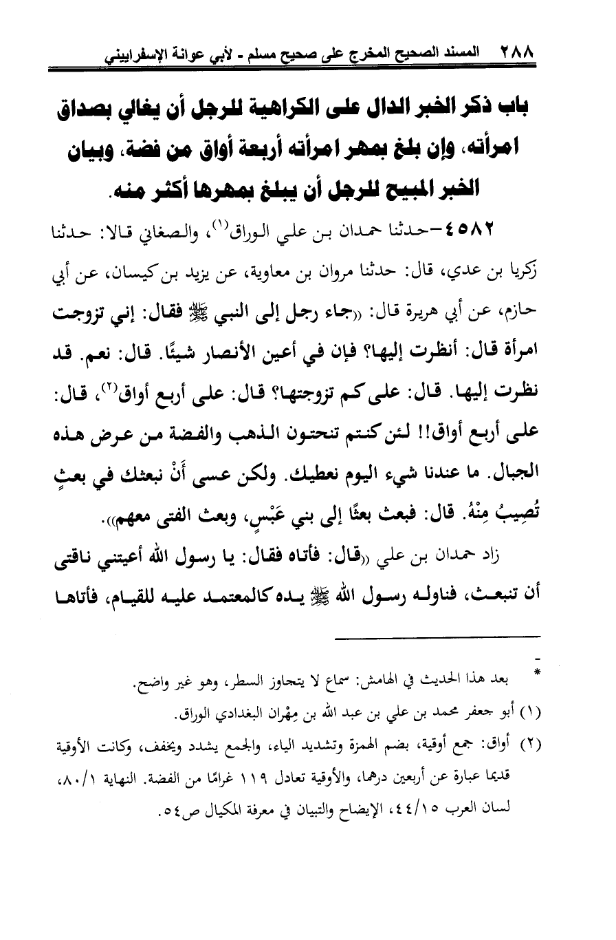 4582 - حدثنا حمدان بن علي الوراق (¬1)، والصغاني قالا: حدثنا زكريا ابن عدي، قال: حدثنا مروان بن معاوية، عن يزيد بن كيسان، عن أبي حازم، عن أبي هريرة قال: "جاء رجل إلى النبي -صلى الله عليه وسلم- فقال: إني تزوجت امرأة قال: أنظرت إليها؟ فإن في أعين الأنصار شيئًا. قال: نعم. قد نظرت إليها. قال: على كم تزوجتها؟ قال: على أربع أواق (¬2)، قال: على أربع أواق!! لئن كنتم تنحتون الذهب والفضة من عرض هذه الجبال. ما عندنا شيء اليوم نعطيك. ولكن عسى أَنْ نبعثك في بعثٍ تُصِيبُ مِنْهُ. قال: فبعث بعثًا إلى بني عَبْسٍ، وبعث الفتى معهم".