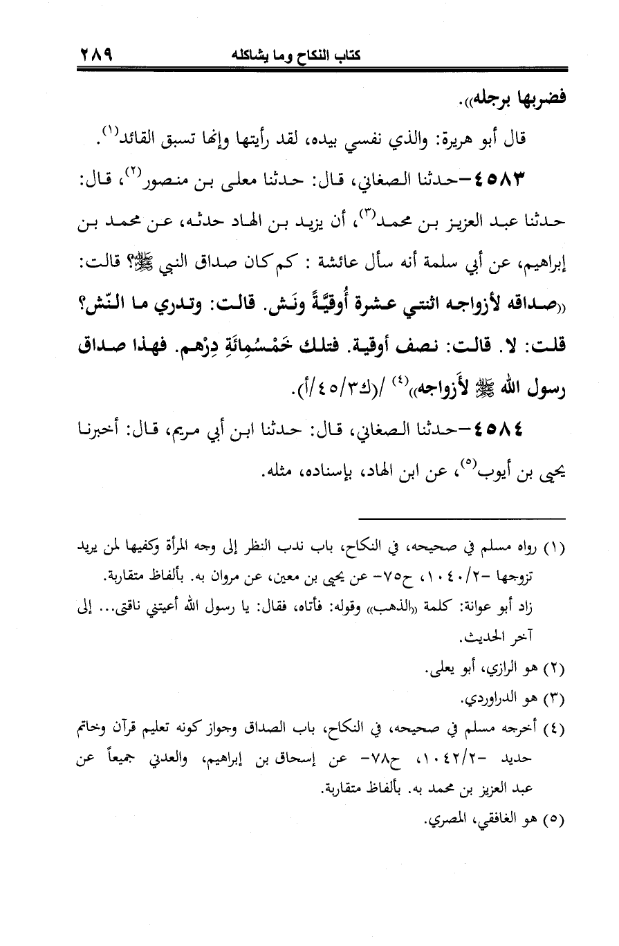 4583 - حدثنا الصغاني، قال: حدثنا معلى بن منصور (¬1)، قال: حدثنا عبد العزيز بن محمد (¬2)، أن يزيد بن الهاد حدثه، عن محمد بن إبراهيم، عن أبي سلمة أنه سأل عائشة: كم كان صداق النبي -صلى الله عليه وسلم-؟ قالت: "صداقه لأزواجه اثنتي عشرة أُوقيَّةً ونَش. قالت: وتدري ما النّش؟ قلت: لا. قالت: نصف أوقية. فتلك خَمْسُمِائَةِ دِرْهم. فهذا صداق رسول الله -صلى الله عليه وسلم- لأَزواجه" (¬3).
