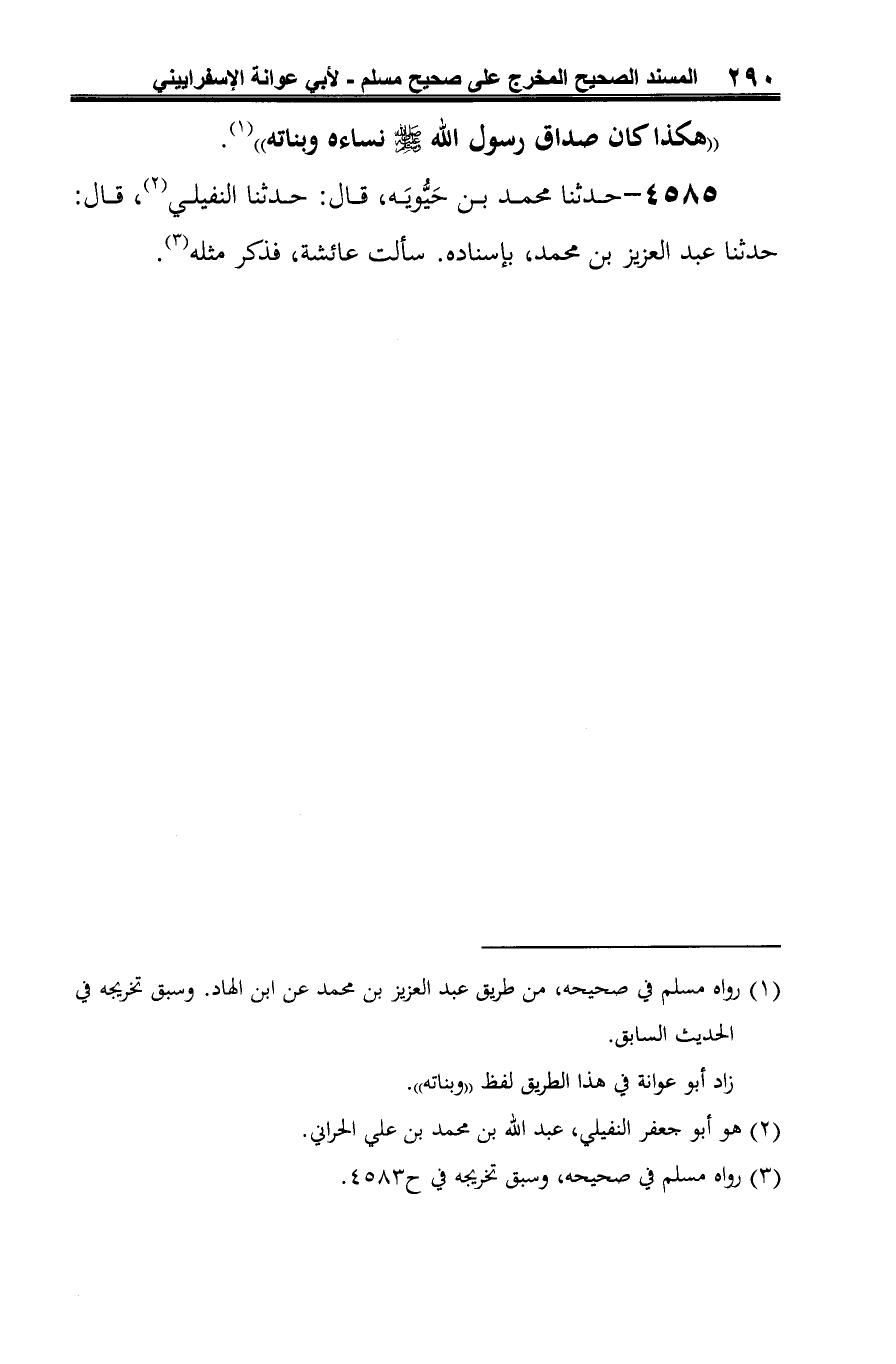 4585 - حدثنا محمد بن حَيُّويَه، قال: حدثنا النفيلي (¬1)، قال: حدثنا عبد العزيز بن محمد، بإسناده. سألت عائشة، فذكر مثله (¬2).