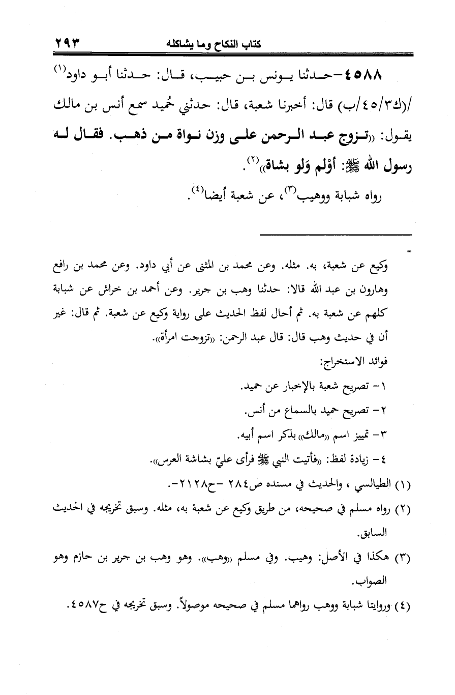 4588 - حدثنا يونس بن حبيب، قال: حدثنا أبو داود (¬1) قال: أخبرنا شعبة، قال: حدثني حُميد سمع أنس بن مالك يقول: "تزوج عبد الرحمن على وزن نواة من ذهب. فقال له رسول الله -صلى الله عليه وسلم-: أوْلم وَلو بشاة" (¬2).