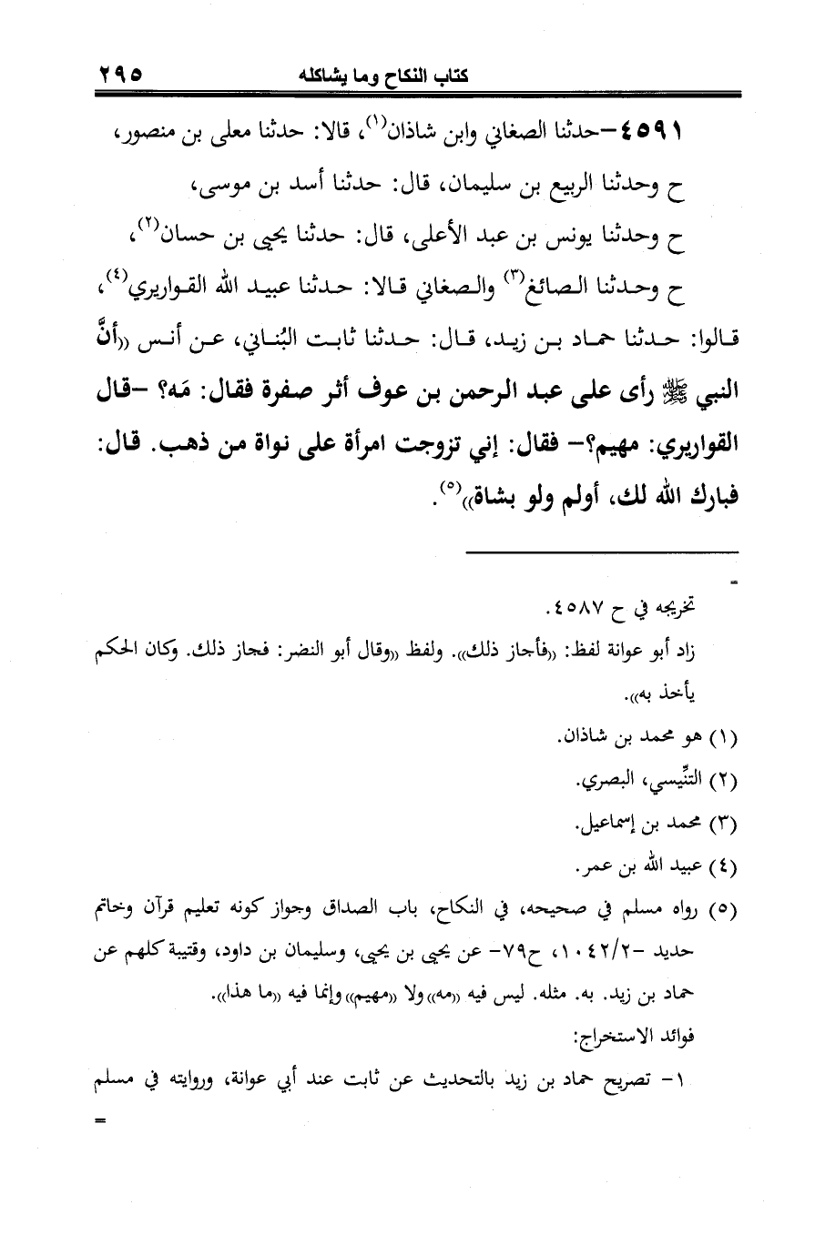 ح وحدثنا الصائغ (¬3) والصغاني قالا: حدثنا عبيد الله القواريري (¬4)، قالوا: حدثنا حماد بن زيد، قال: حدثنا ثابت البُناني، عن أنس "أنَّ النبي -صلى الله عليه وسلم- رأى على عبد الرحمن بن عوف أثر صفرة فقال: مَه؟ -قال القواريري: مهيم؟ - فقال: إني تزوجت امرأة على نواة من ذهب. قال: فبارك الله لك، أولم ولو بشاة" (¬5).