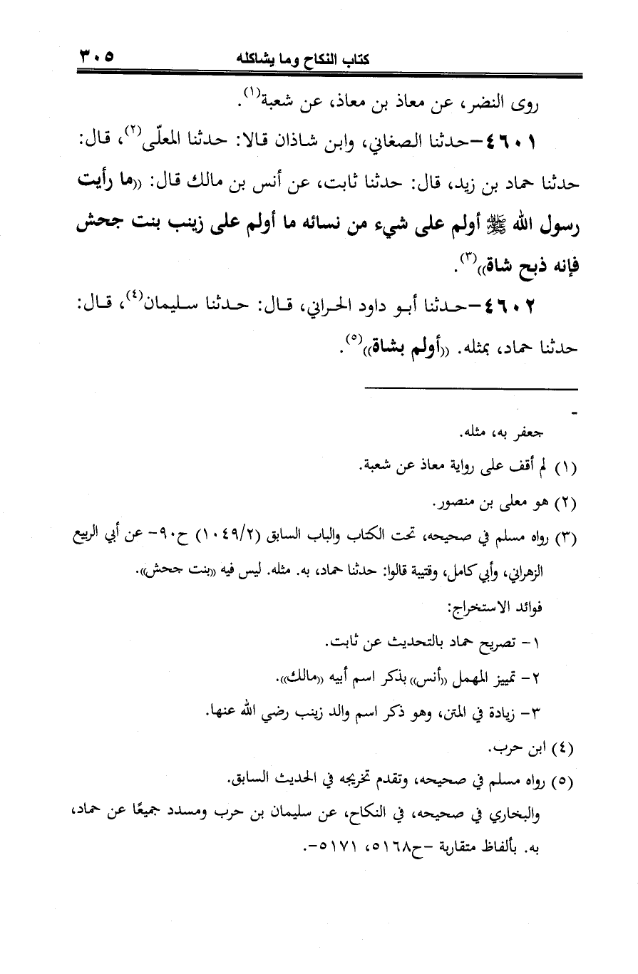 4601 - حدثنا الصغاني، وابن شاذان قالا: حدثنا المعلّى (¬1)، قال: حدثنا حماد بن زيد، قال: حدثنا ثابت، عن أنس بن مالك قال: "ما رأيت رسول الله -صلى الله عليه وسلم- أولم على شيء من نسائه ما أولم على زينب بنت جحش فإنه ذبح شاة" (¬2).