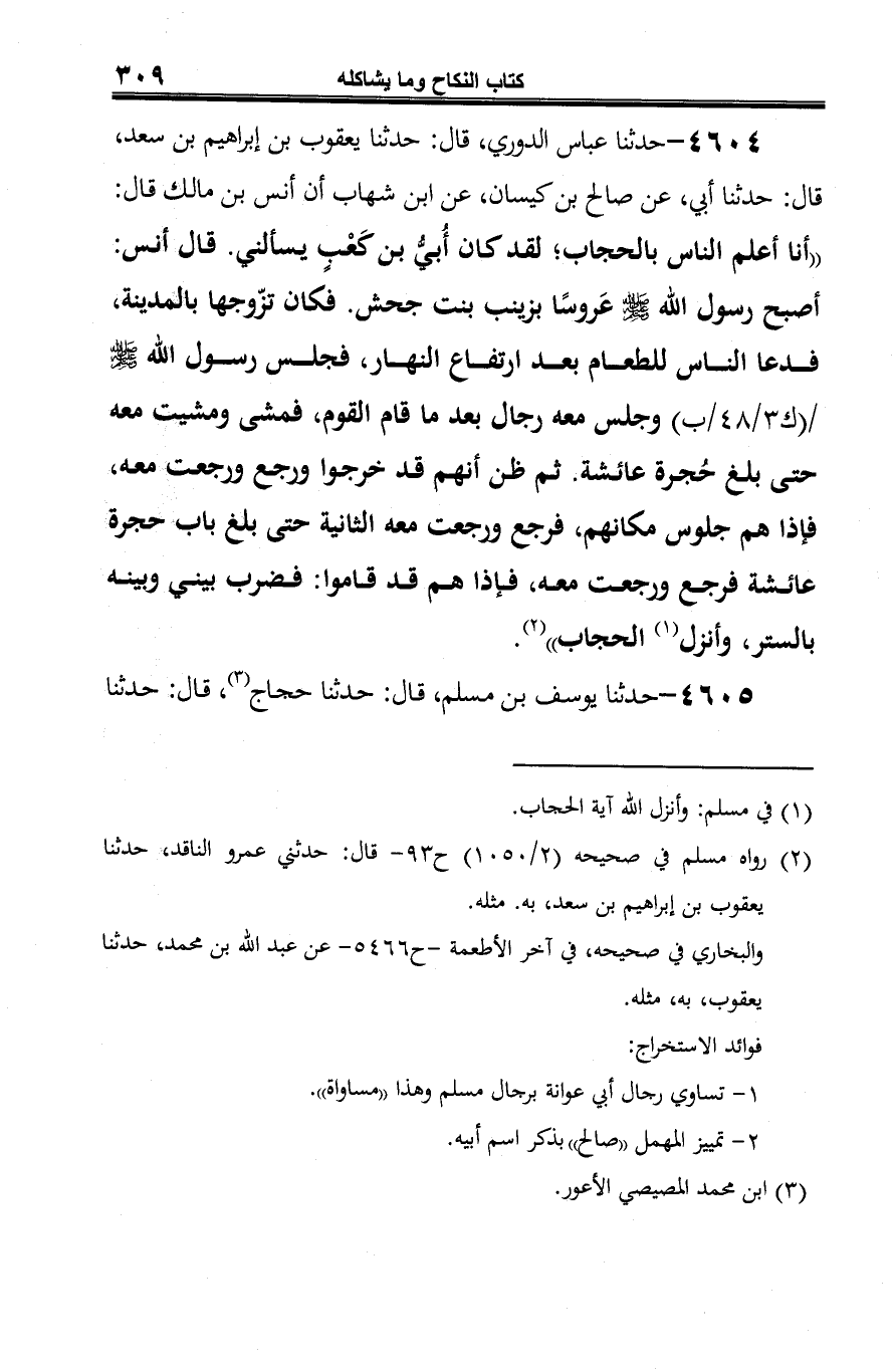 4604 - حدثنا عباس الدوري، قال: حدثنا يعقوب بن إبراهيم بن سعد، قال: حدثنا أبي، عن صالح بن كيسان، عن ابن شهاب أن أنس بن مالك قال: "أنا أعلم الناس بالحجاب؟ لقد كان أُبيُّ بن كَعْبٍ يسألني. قال أنس: أصبح رسول الله -صلى الله عليه وسلم- عَروسًا بزينب بنت جحش. فكان تزّوجها بالمدينة، فدعا الناس للطعام بعد ارتفاع النهار، فجلس رسول الله -صلى الله عليه وسلم- وجلس معه رجال بعد ما قام القوم، فمضى ومشيت معه حتى بلغ حُجرة عائشة. ثم ظن أنهم قد خرجوا ورجع ورجعت معه، فإذا هم جلوس مكانهم، فرجع ورجعت معه الثانية حتى بلغ باب حجرة عائشة فرجع ورجعت معه، فإذا هم قد قاموا: فضرب بيني وبينه بالستر، وأنزل (¬1) الحجاب" (¬2).