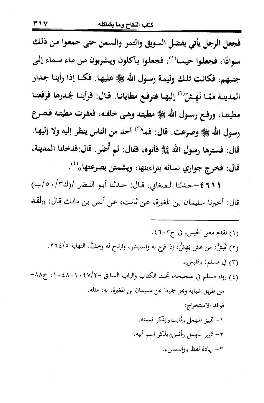 -[318]- رأيت لرسول الله -صلى الله عليه وسلم- وليمة ما فيها خبز ولا لحم. قال: صارت صفية لدحية الكلبي في مقسمه ... ". وذكر الحديث، بطوله بمعناه بتمامه (¬1).