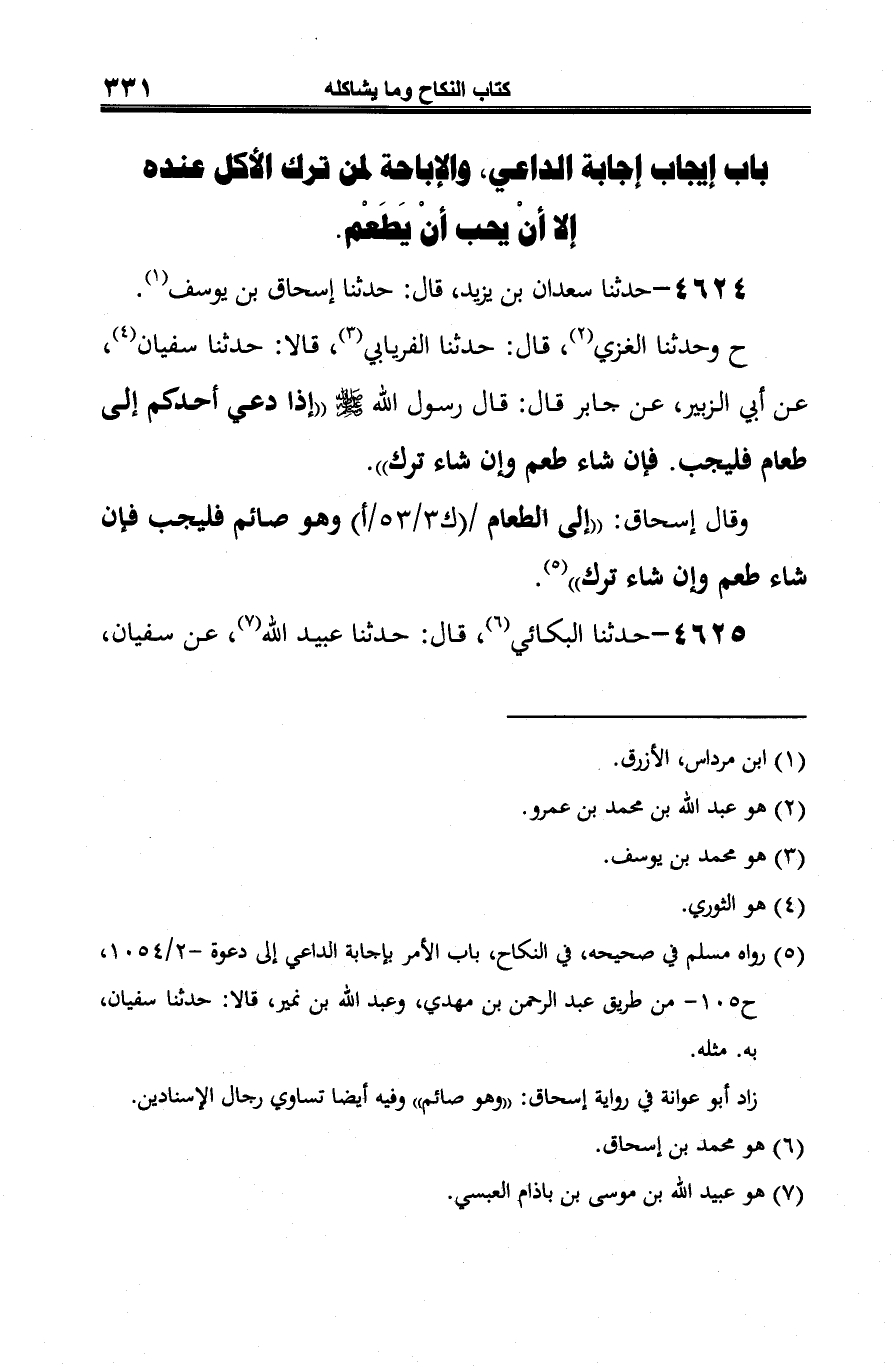 (¬5) رواه مسلم في صحيحه، في النِّكاح، باب الأمر بإجابة الداعي إلى دعوة -2/ 1054، ح 105 - من طريق عبد الرّحمن بن مهدي، وعبد الله بن نمر، قالا: حدّثنا سفيان، به. مثله.