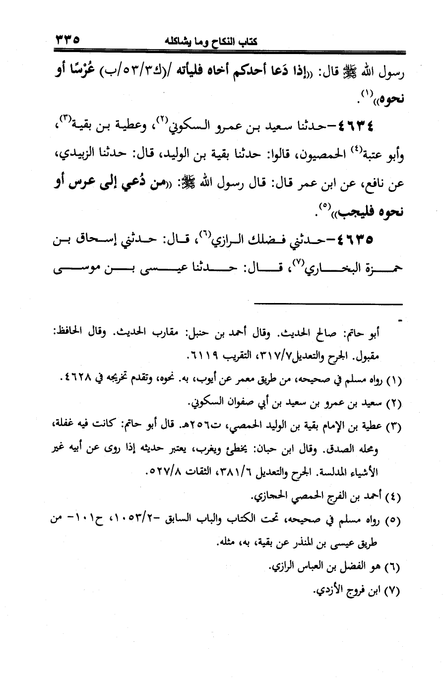 4634 - حدّثنا سعيد بن عمرو السكوني (¬1)، وعطية بن بقية (¬2)، وأبو عتبة (¬3) الحمصيون، قالوا: حدّثنا بقية بن الوليد، قال: حدّثنا الزبيدي، عن نافع، عن ابن عمر قال: قال رسول الله -صلى الله عليه وسلم-: "من دُعي إلى عرس أو نحوه فليجب" (¬4).