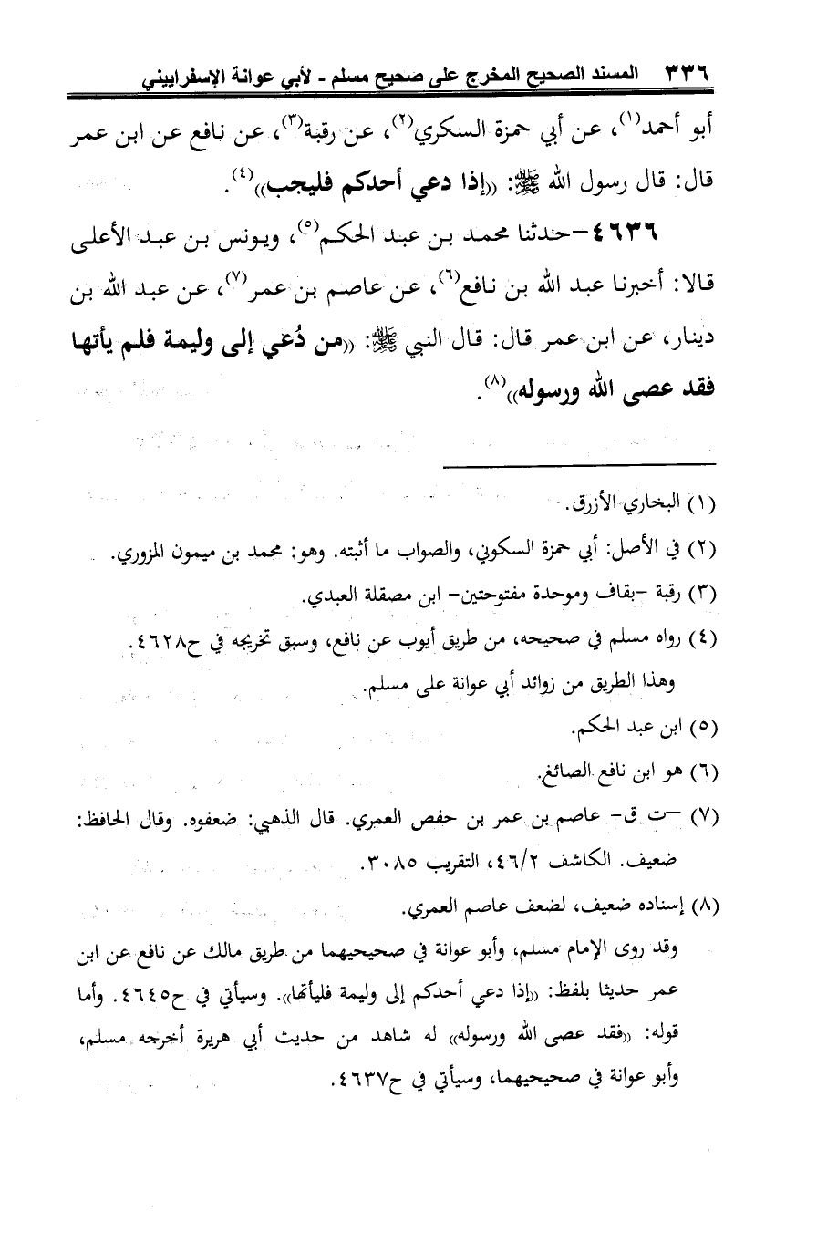 وقد روى الإمام مسلم، وأبو عوانة في صحيحيهما من طريق مالك عن نافع عن ابن عمر حديثا بلفظ: "إذا دعي أحدكم إلى وليمة فليأتها". وسيأتي في ح 4645. وأمّا قوله: "فقد عصى الله ورسوله" له شاهد من حديث أبي هريرة أخرجه مسلم، وأبو عوانة في صحيحيهما، وسيأتي في ح 4637.