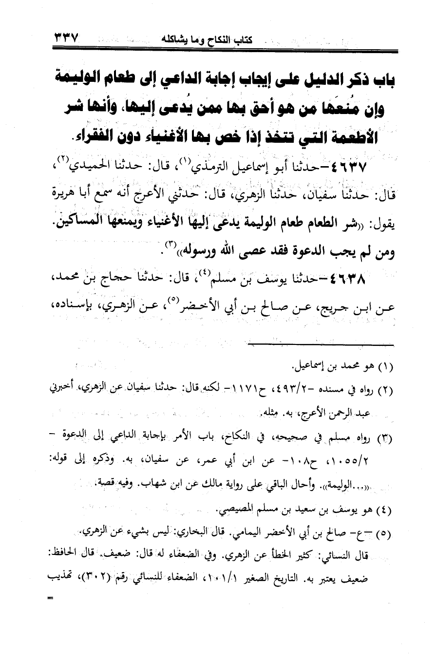 4637 - حدّثنا أبو إسماعيل التّرمذيّ (¬1)، قال: حدّثنا الحميدي (¬2)، قال: حدّثنا سفيان، حدّثنا الزّهريُّ، قال: حدثني الأعرج أنه سمع أبا هريرة يقول: "شر الطّعام طعام الوليمة يدعى إليها الأغنياء ويمنعها المساكين. ومن لم يجب الدّعوة فقد عصى الله ورسوله" (¬3).
