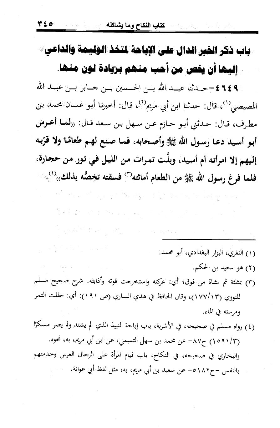 4649 - حدّثنا عبد الله بن الحسين بن جابر بن عبد الله المصيصي (¬1)، قال: حدّثنا ابن أبي مريم (¬2)، قال: أخبرنا أبو غسان محمّد بن مطرف، قال: حدثني أبو حازم عن سهل بن سعد قال: "لما أعرس أبو أسيد دعا رسول الله -صلى الله عليه وسلم- وأصحابه، فما صنع لهم طعامًا ولا قرّبه إليهم إِلَّا امرأته أم أسيد، وبلَّت تمرات من اللّيل في تور من حجارة، فلما فرغ رسول الله -صلى الله عليه وسلم- من الطّعام أماثته (¬3) فسقته تخصُّه بذلك" (¬4).