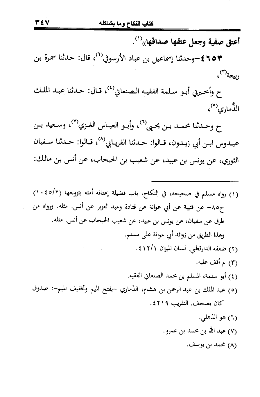 -[348]- "أنَّ رسول الله -صلى الله عليه وسلم- أعتق صفية وجعل عتقها مهرها" (¬8).
