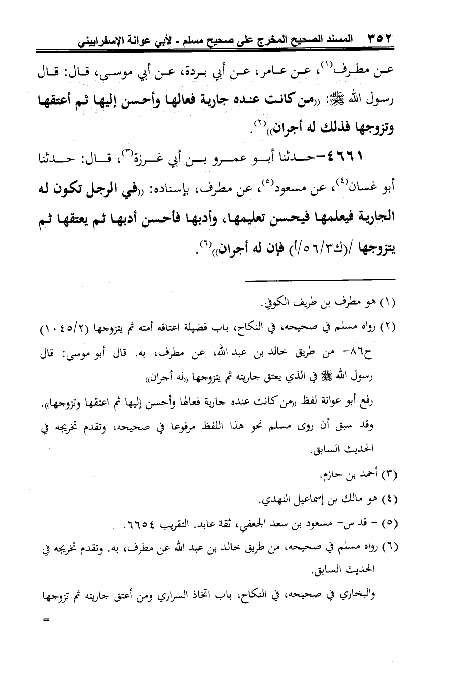 4661 - حدّثنا أبو عمرو بن أبي غرزة (¬1)، قال: حدّثنا أبو غسان (¬2)، عن مسعود (¬3)، عن مطرف، بإسناده: "في الرَّجل تكون له الجارية فيعلمها فيحسن تعليمها، وأدبها فأحسن أدبها ثمّ يعتقها ثمّ يتزوجها فإن له أجران" (¬4).