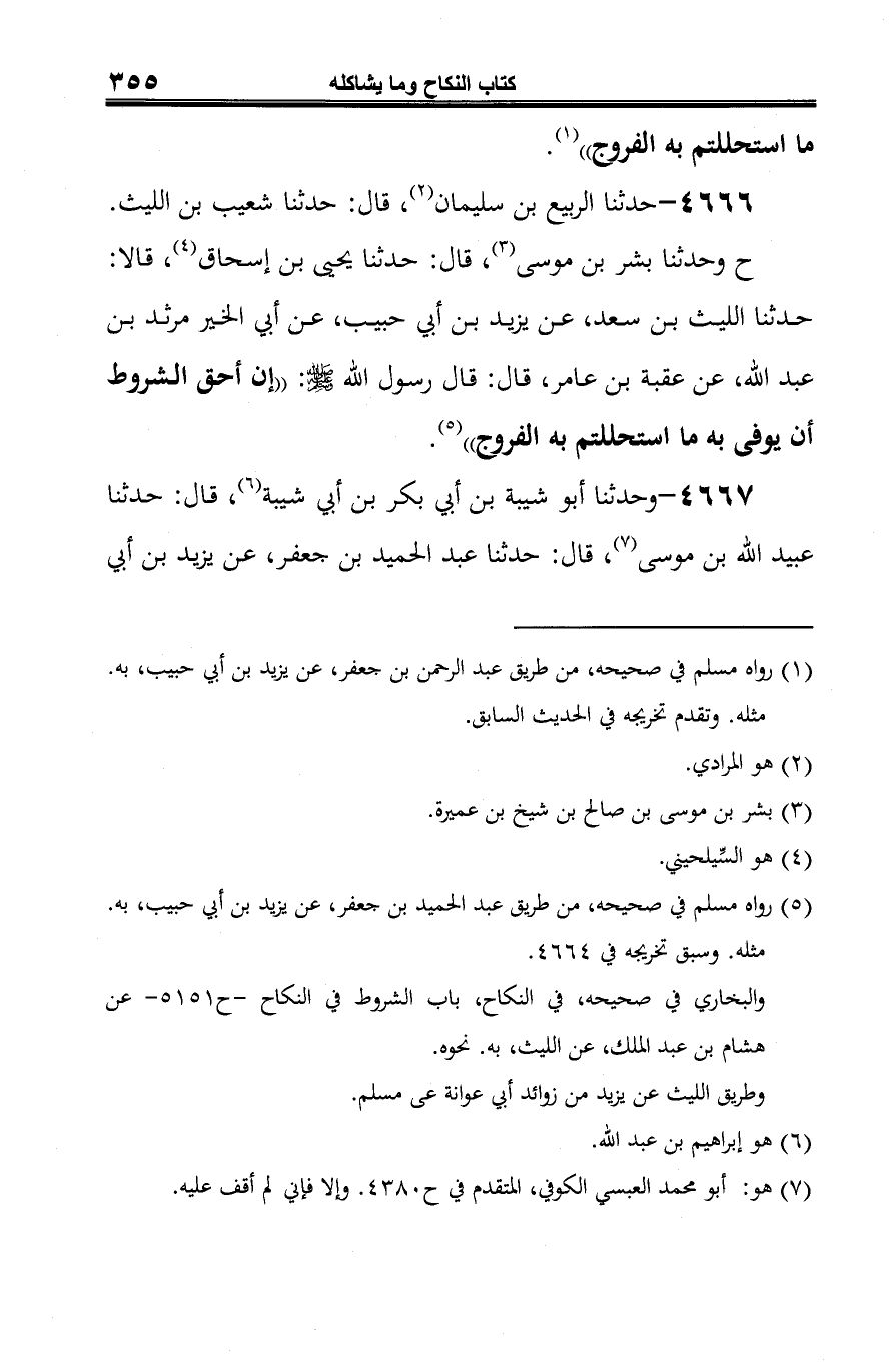 ح وحدثنا بشر بن موسى (¬2)، قال: حدّثنا يحيى بن إسحاق (¬3)، قالا: حدّثنا اللَّيث بن سعد، عن يزيد بن أبي حبيب، عن أبي الخير مرثد بن عبد الله، عن عقبة بن عامر، قال: قال رسول الله -صلى الله عليه وسلم-: "إن أحق الشروط أن يوفى به ما استحللتم به الفروج" (¬4).