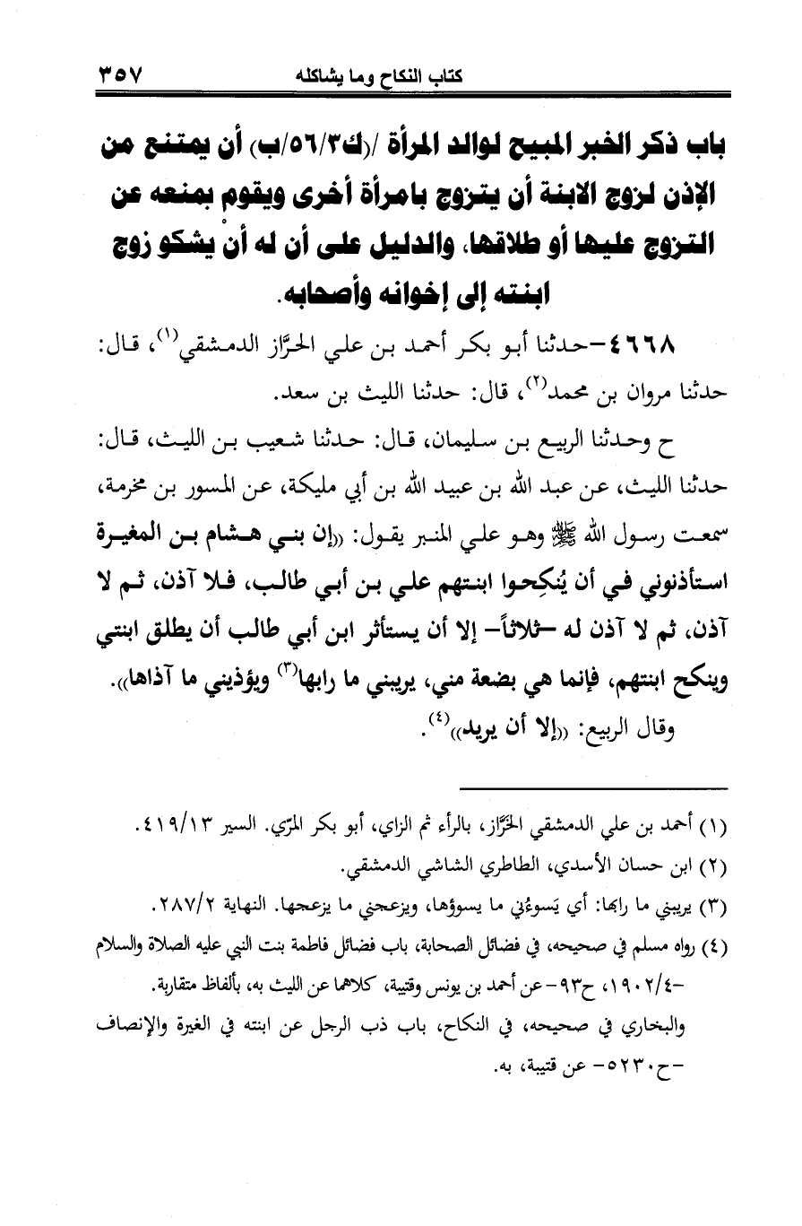 ح وحدثنا الربيع بن سليمان، قال: حدّثنا شعيب بن اللَّيث، قال: حدّثنا اللَّيث، عن عبد الله بن عبيد الله بن أبي مليكة، عن المسور بن مخرمة، سمعت رسول الله -صلى الله عليه وسلم- وهو على المنبر يقول: "إن بني هشام بن المغيرة استأذنوني في أن يُنكِحوا ابنتهم علي بن أبي طالب، فلا آذن، ثمّ لا آذن، ثمّ لا آذن له ثلاثًا -إِلَّا أن يستأثر ابن أبي طالب أن يطلق ابنتي وينكح ابنتهم، فإنما هي بضعة مني، يريبني ما رابها (¬3) ويؤذيني ما آذاها".