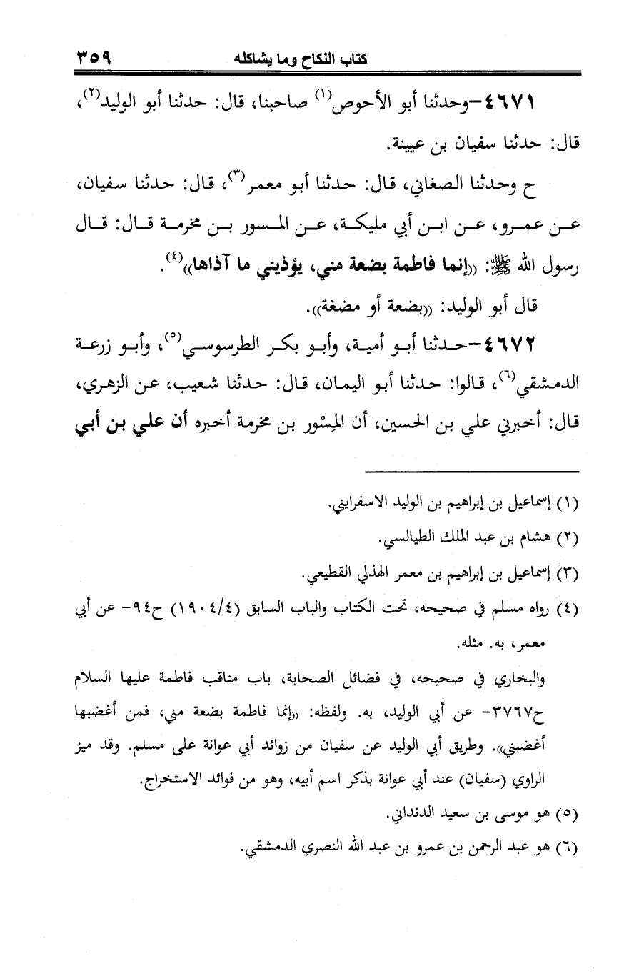 4672 - حدّثنا أبو أمية، وأبو بكر الطرسوسي (¬1)، وأبو زرعة الدمشقي (¬2)، قالوا: حدثنا أبو اليمان، قال: حدّثنا شعيب، عن الزّهريّ، قال: أخبرني علي بن الحسين، أن المِسْور بن مخرمة أخبره أن علي بن أبي