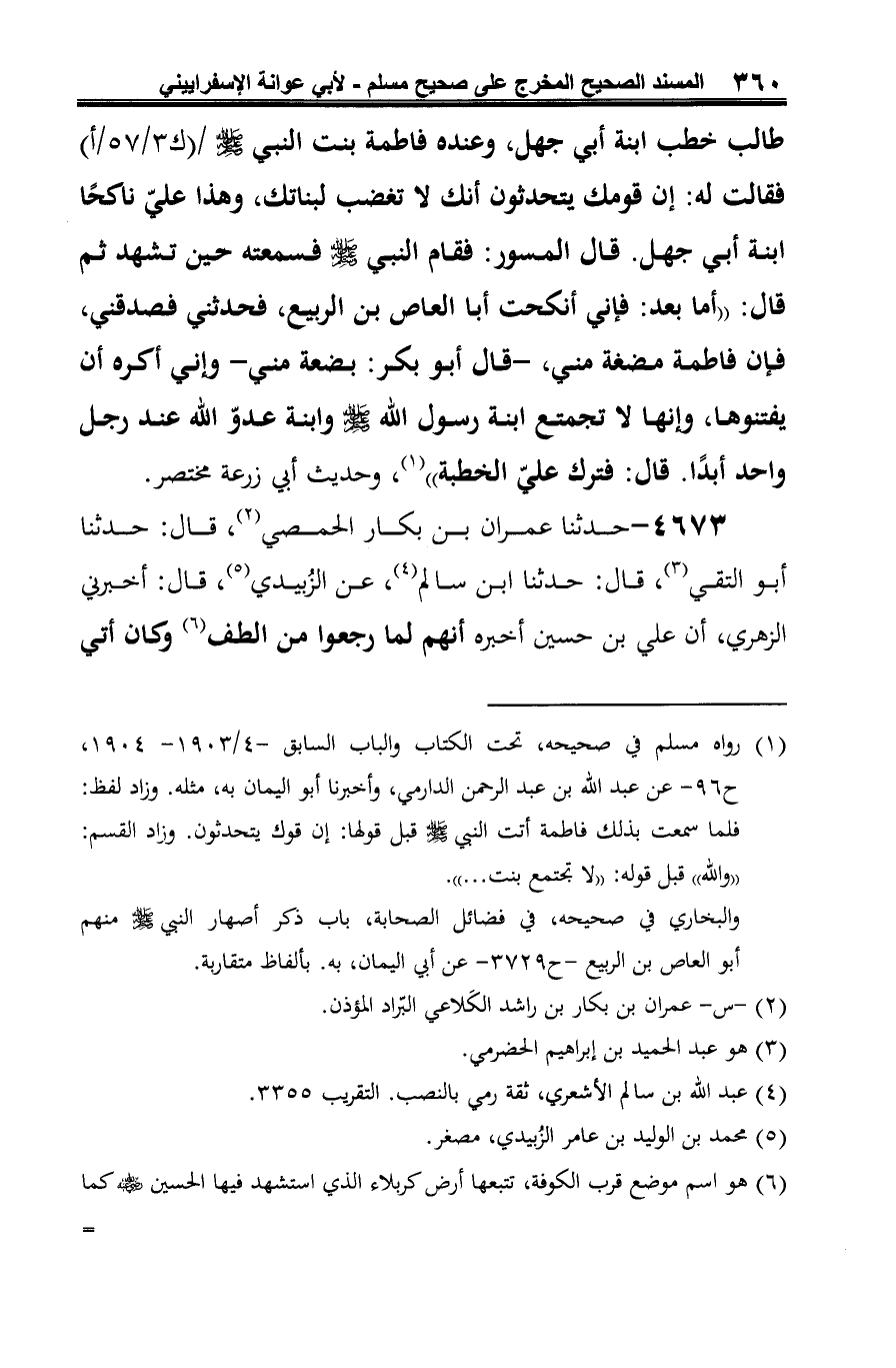 4 - زاد أبو عوانة في أول الحديث: "أنهم رجعوا من الطف، وكان أتي به يزيدَ بن معاوية أسيرًا في رهط هو رابعهم". وزاد أيضًا: "إن قومك يتحدثون أنك لا تغضب لبناتك".