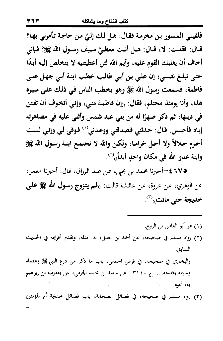 4675 - أخبرنا محمّد بن يحيى، عن عبد الرزّاق، قال: أخبرنا معمر، عن الزهري، عن عروة، عن عائشة قالت: "لم يتزوج رسول الله -صلى الله عليه وسلم- على خديجة حتّى ماتت" (¬1).