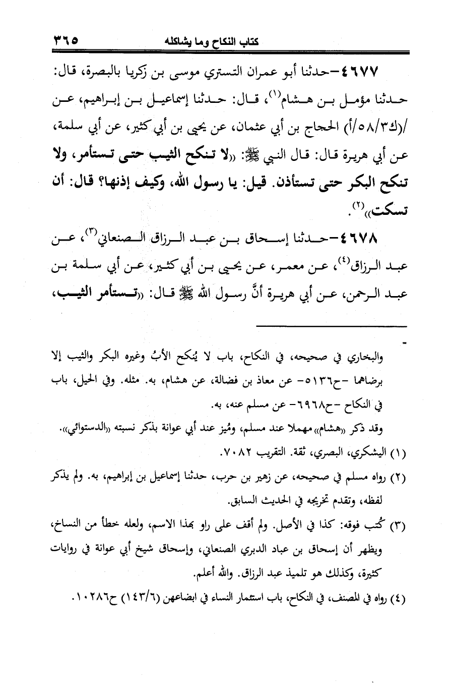 4677 - حدّثنا أبو عمران التستري موسى بن زكريا بالبصرة، قال: حدّثنا مؤمل بن هشام (¬1)، قال: حدّثنا إسماعيل بن إبراهيم، عن الحجاج بن أبي عثمان، عن يحيى بن أبي كثير، عن أبي سلمة، عن أبي هريرة قال: قال النَّبي -صلى الله عليه وسلم-: "لا تنكح الثيب حتّى تستأمر، ولا تنكح البكر حتّى تستأذن. قيل: يا رسول الله، كيف إذنها؟ قال: أن تسكت" (¬2).