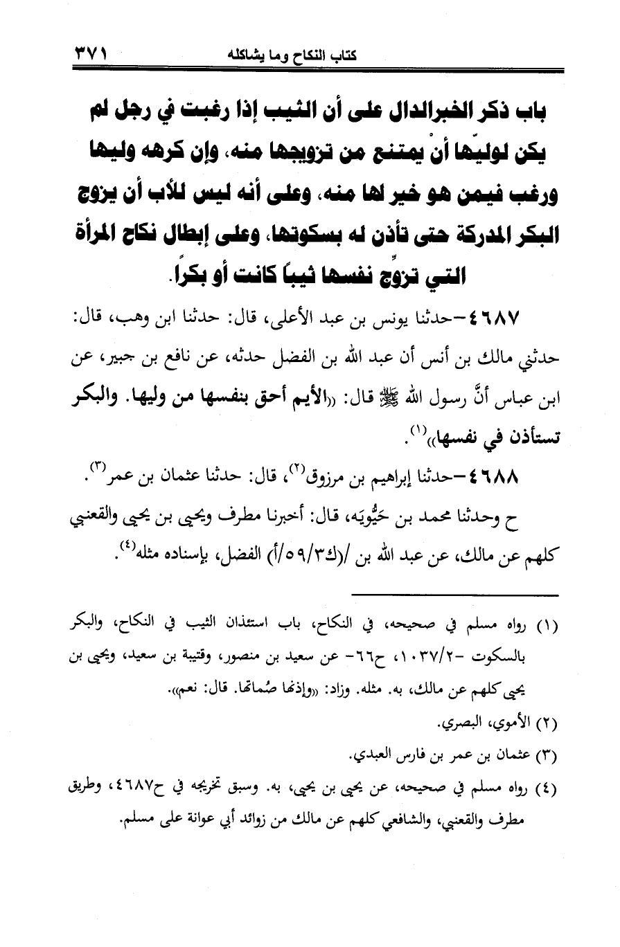 4687 - حدّثنا يونس بن عبد الأعلى، قال: حدّثنا ابن وهب، قال: حدثني مالك بن أنس أن عبد الله بن الفضل حدثه، عن نافع بن جبير، عن ابن عبّاس أنَّ رسول الله -صلى الله عليه وسلم- قال: "الأيم أحق بنفسها من وليها. والبكر تستأذن في نفسها" (¬1).