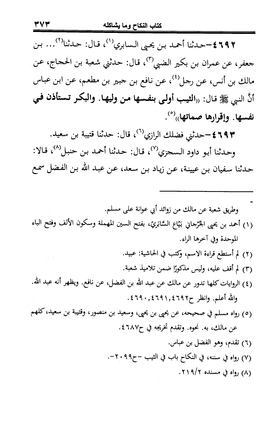 4692 - حدّثنا أحمد بن يحيى السابري (¬1)، قال: حدّثنا (¬2) ... بن جعفر، عن عمران بن بكير الضبي (¬3)، قال: حدثني شعبة بن الحجاج، عن مالك بن أنس، عن رجل (¬4)، عن نافع بن جبير بن مطعم، عن ابن عبّاس أنَّ النبي -صلى الله عليه وسلم- قال: "الثيب أولى بنفسها من وليها. والبكر تستأذن في نفسها. وإقرارها صماتها" (¬5).