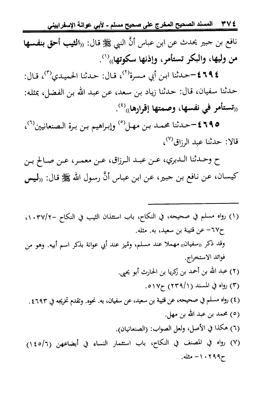 4694 - حدّثنا ابن أبي مسرة (¬1)، قال: حدّثنا الحميدي (¬2)، قال: حدّثنا سفيان، قال: حدّثنا زياد بن سعد، عن عبد الله بن الفضل، بمثله: "تستأمر في نفسها، وصمتها إقرارها" (¬3).