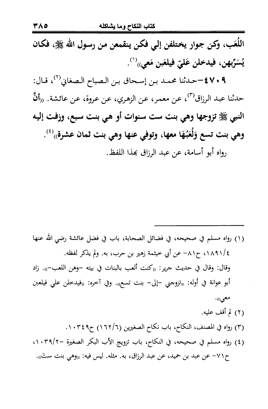 4709 - حدّثنا محمّد بن إسحاق بن الصباح الصغاني (¬1)، قال: حدّثنا عبد الرزّاق (¬2)، عن معمر، عن الزّهريّ، عن عروة، عن عائشة. "أنَّ النّبيّ -صلى الله عليه وسلم- تزوجها وهي بنت ست سنوات أو هي بنت سبع، وزفت إليه وهي بنت تسع وَلُعَبُهَا معها، وتوفي عنها وهي بنت ثمان عشرة" (¬3).