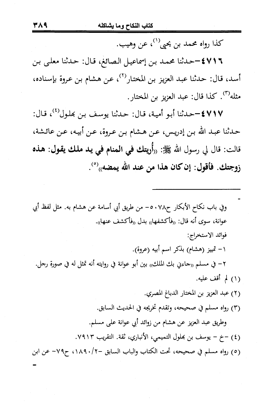 4717 - حدّثنا أبو أمية، قال: حدّثنا يوسف بن بهلول (¬1)، قال: حدّثنا عبد الله بن إدريس، عن هشام بن عروة، عن أبيه، عن عائشة، قالت: قال لي رسول الله -صلى الله عليه وسلم-: "أُريتك في المنام في يد ملك يقول: هذه زوجتك. فأقول: إن كان هذا من عند الله يمضه" (¬2).