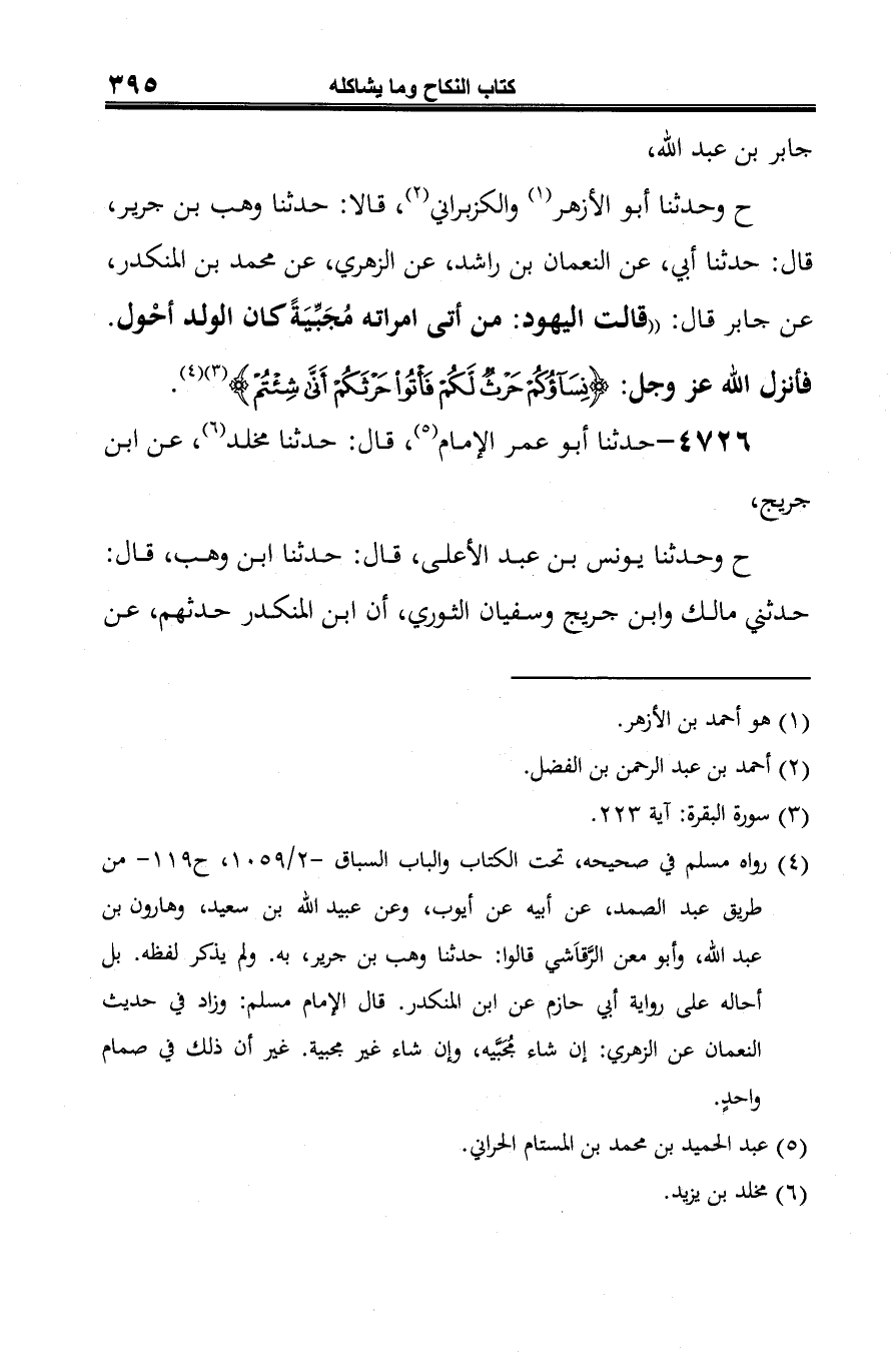 -[396]- جابر بن عبد الله أن اليهود قالوا للمسلمين: "من أتى امرأته وهي مدبرة جاء ولده أحْول، فأنزل الله -عَزَّ وَجَلَّ- {نِسَاؤُكُمْ حَرْثٌ لَكُمْ} قال ابن جريج في حديثه: "مقبلة ومدبرة إذا كان ذلك في القبل" (¬3).