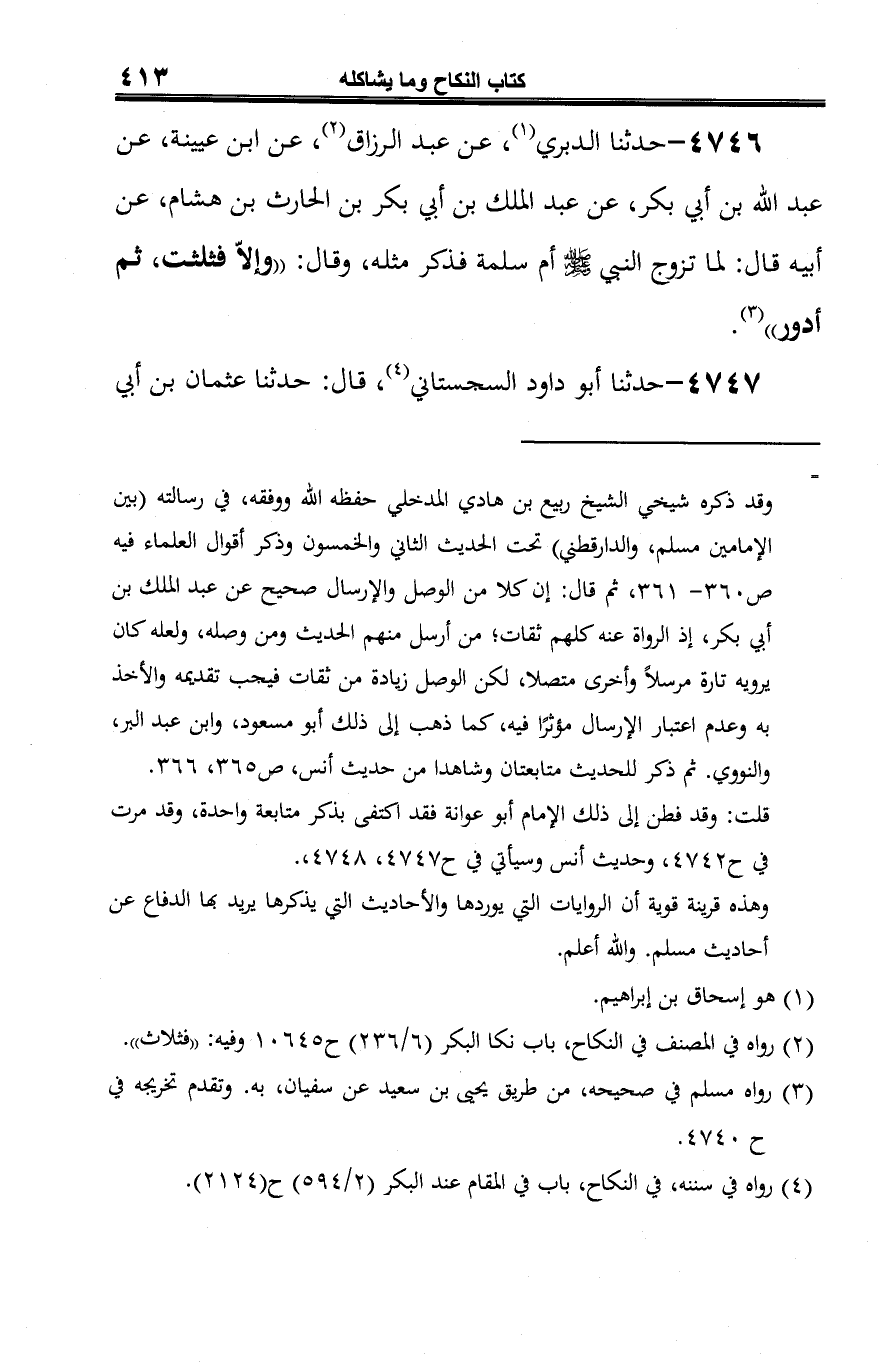 4746 - حدّثنا الدبري (¬1)، عن عبد الرزّاق (¬2)، عن ابن عيينة، عن عبد الله بن أبي بكر، عن عبد الملك بن أبي بكر بن الحارث بن هشام، عن أبيه قال: لما تزوج النبي -صلى الله عليه وسلم- أم سلمة فذكر مثله، وقال: "وإلّا فثلثت، ثمّ أدور" (¬3).