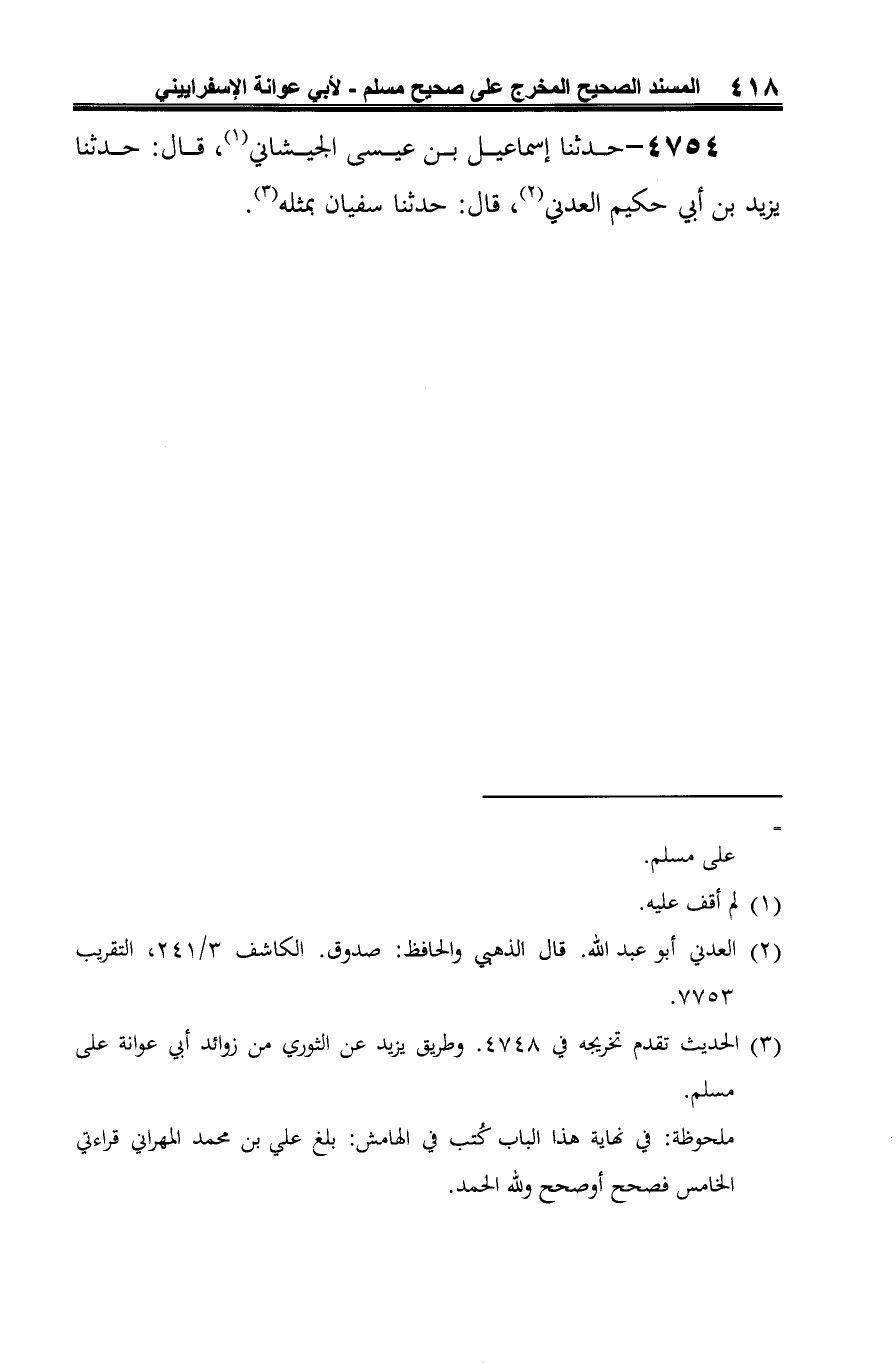 4754 - حدّثنا إسماعيل بن عيسى الجيشاني (¬1)، قال: حدّثنا يزيد بن أبي حكيم العدني (¬2)، قال: حدّثنا سفيان بمثله (¬3).